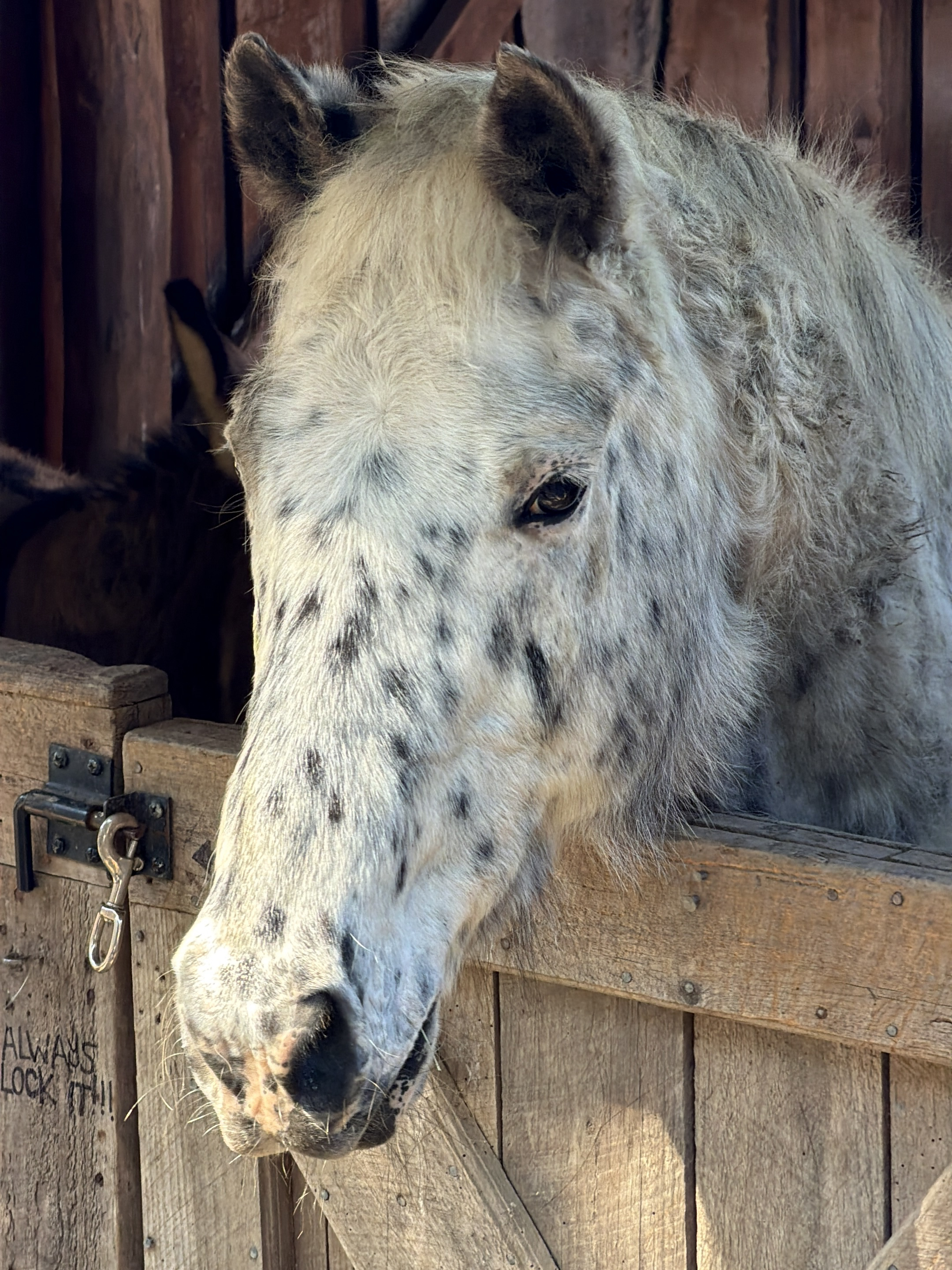 A close-up shot shows a white horse with black spots, leaning over a wooden fence. The horse is in a stable or barn, with a donkey visible in the background on the left. The latch on the fence is visi…read more