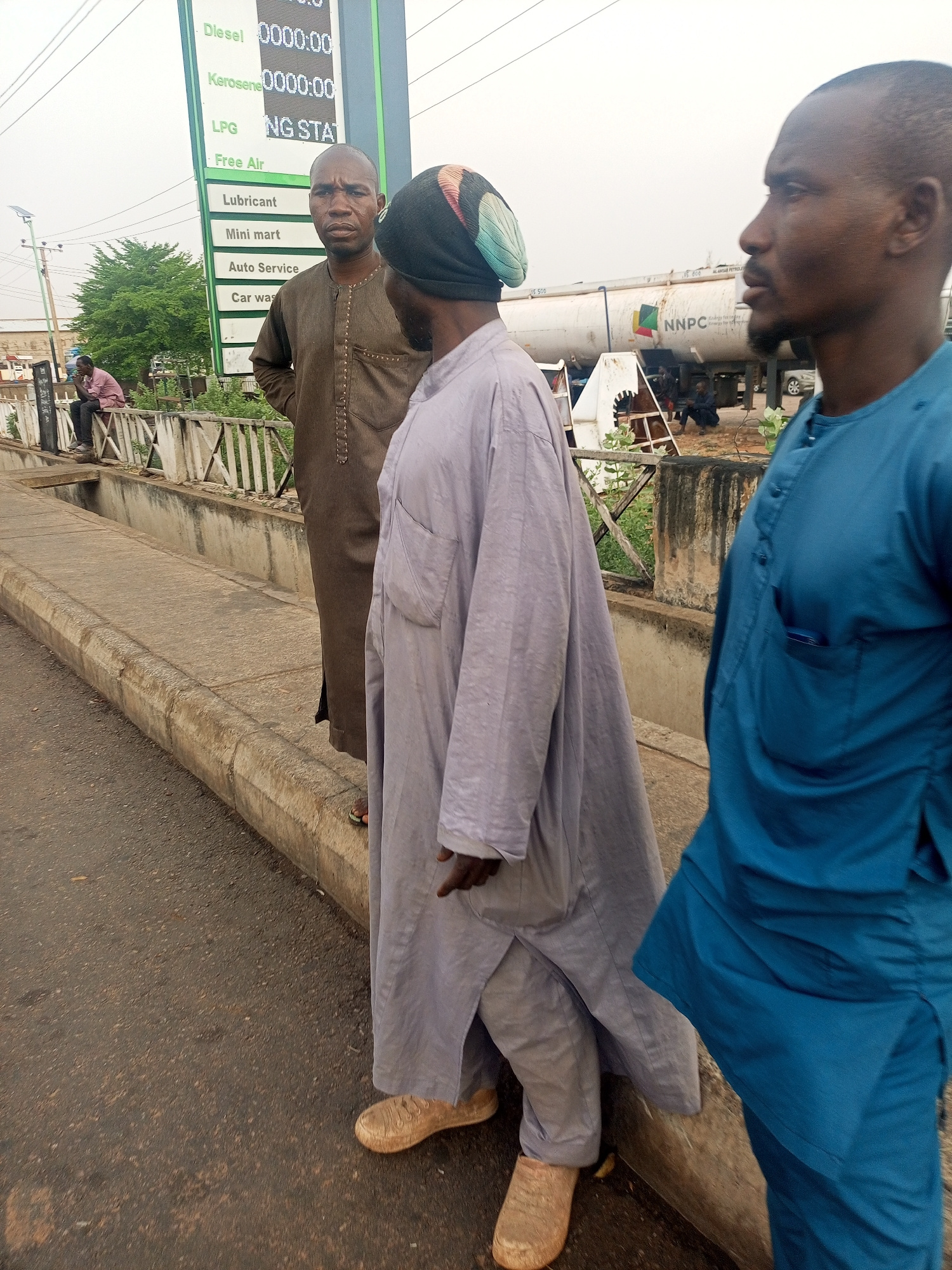 Three men stand beside a road and a petrol station. One man wears a dark brown robe and faces forward. The man in the middle wears a light gray robe and a colorful head covering. The third man faces r…read more