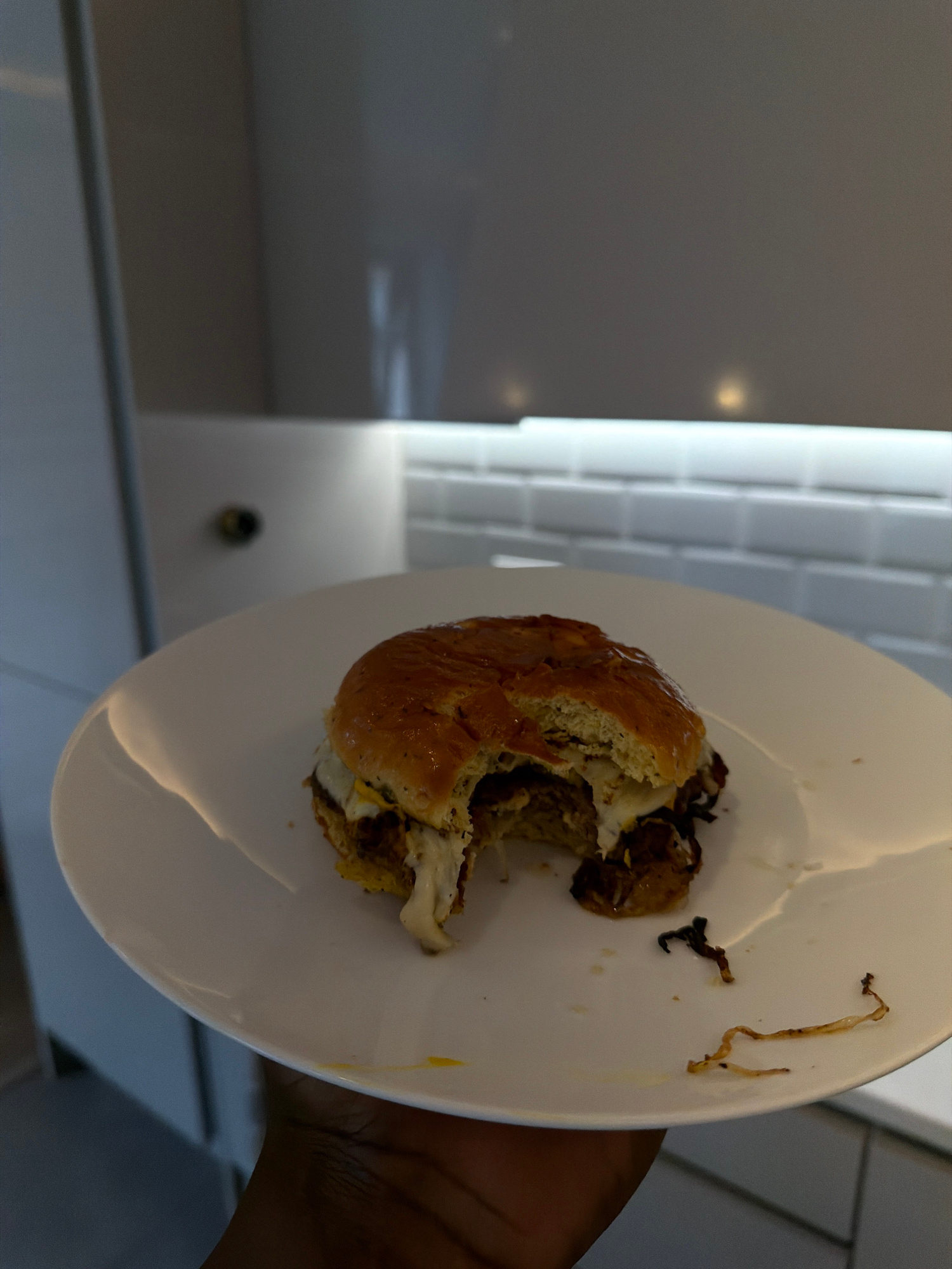 The image displays a close-up, tilted shot of a human hand holding a white plate with a partially eaten burger. The burger features a golden-brown bun, a visible meat patty, melted white cheese or sau…read more