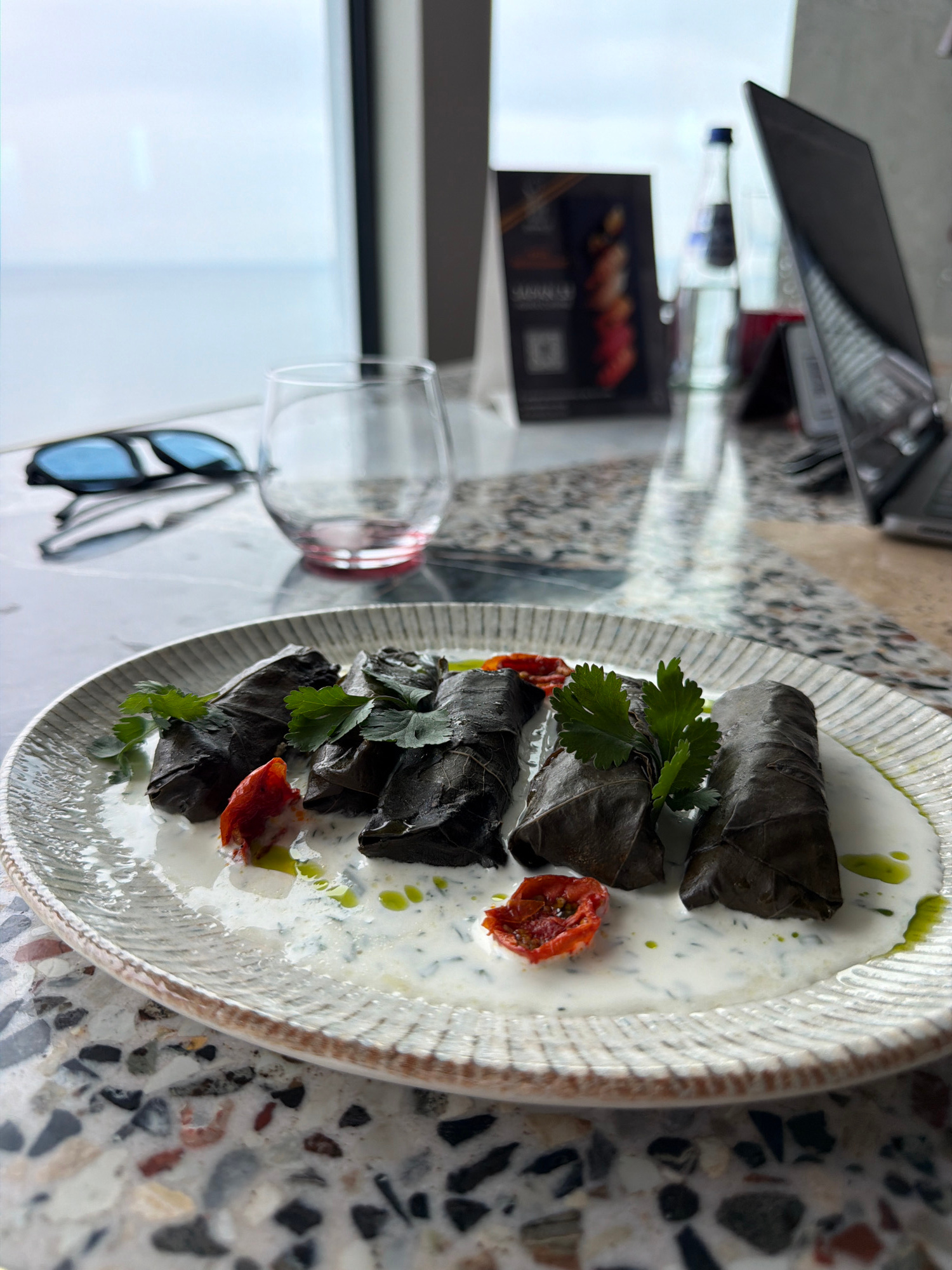The scene depicts a plate of dolma (stuffed grape leaves) served in a creamy sauce and garnished with parsley and sun-dried tomatoes. The dish is presented on a decorative white plate. A glass of redβ¦read more