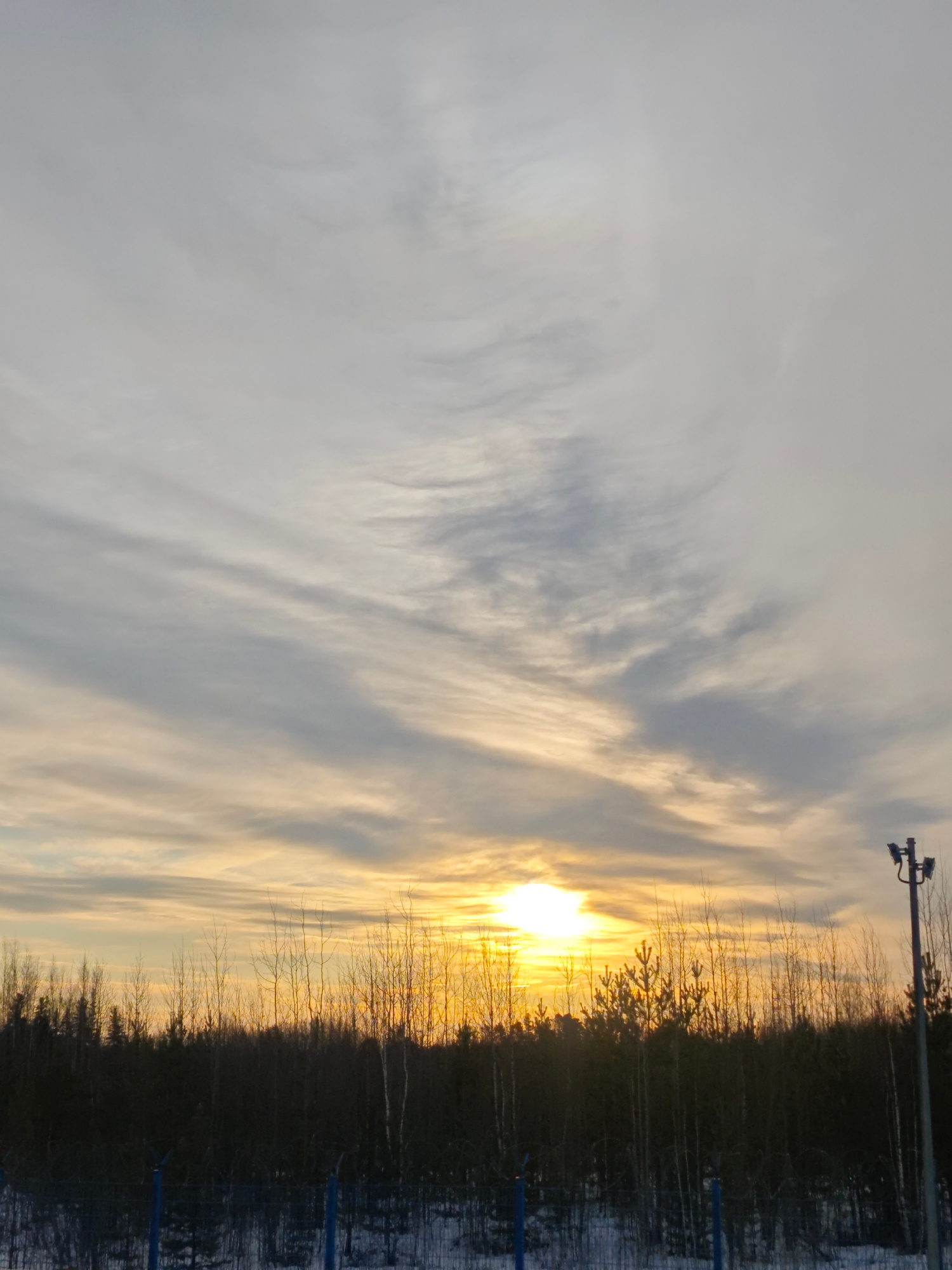 A winter scene in what appears to be the city of Unknown, Russia, shows a forest silhouetted against a sky with a setting sun. The sky is mostly cloudy with long, striated cloud formations. The sun isβ¦read more