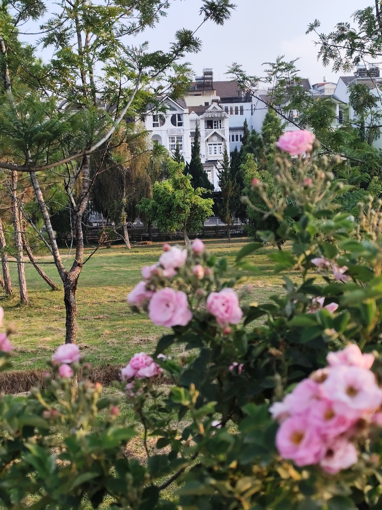 The image shows a garden in Da Lat, Vietnam. In the foreground are pink roses in bloom. Beyond the roses is a grassy lawn with scattered trees. In the background is a white building with multiple storβ¦read more