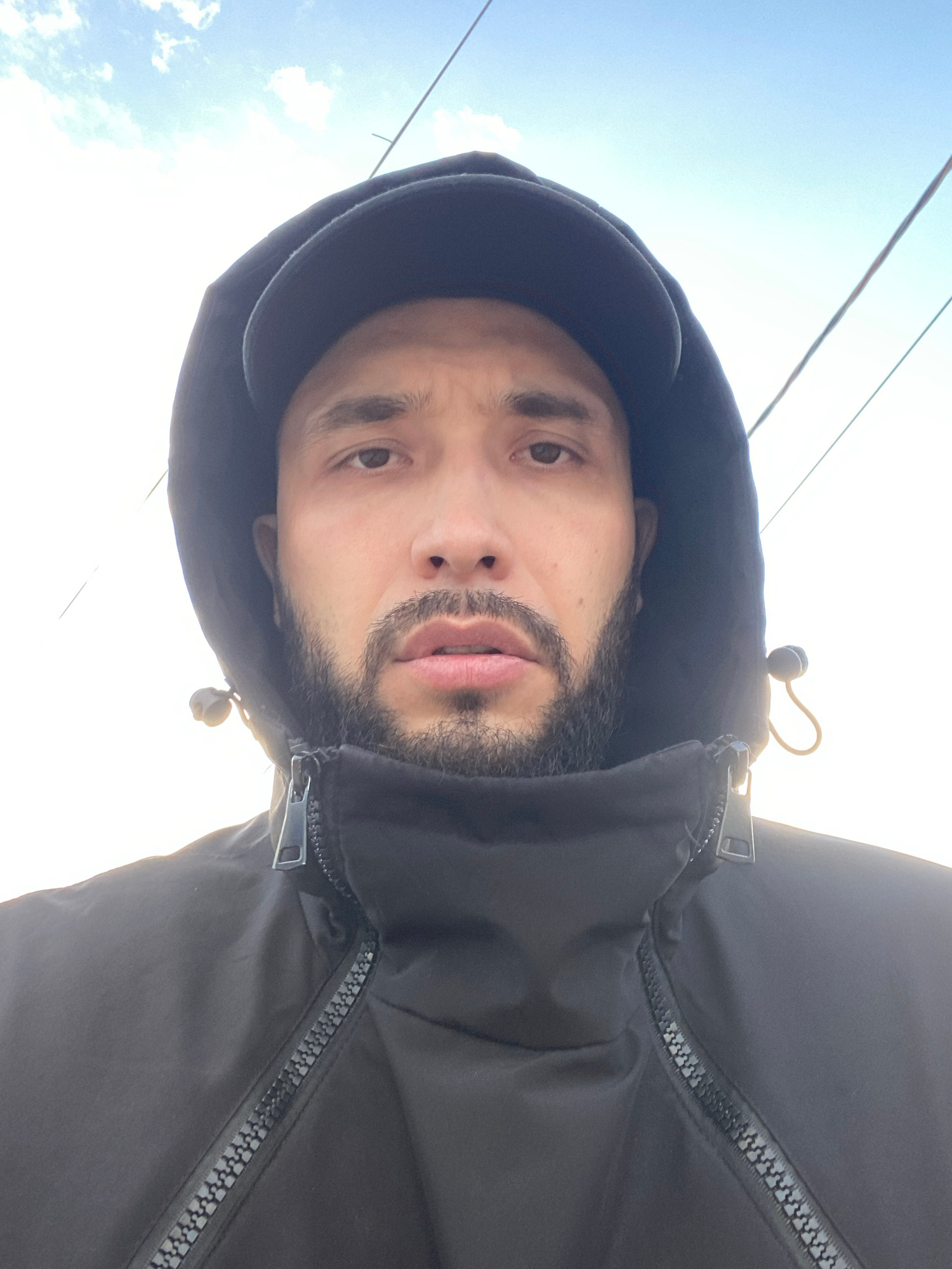 A low-angle, rotated portrait captures a man from the chest up, looking directly downwards towards the camera, which is positioned below him. He is wearing a dark, possibly black, hooded jacket. The j…read more