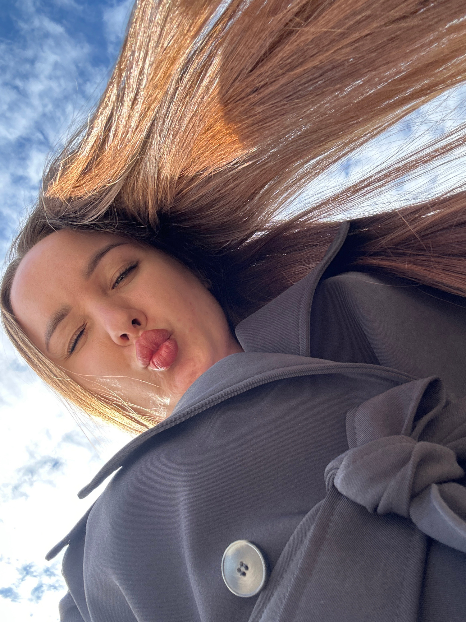 An outdoor, low-angle portrait captures a single individual in the city of Noviy, Russia, positioned above the camera's perspective. The subject, appearing female, exhibits long, light brown to auburn…read more