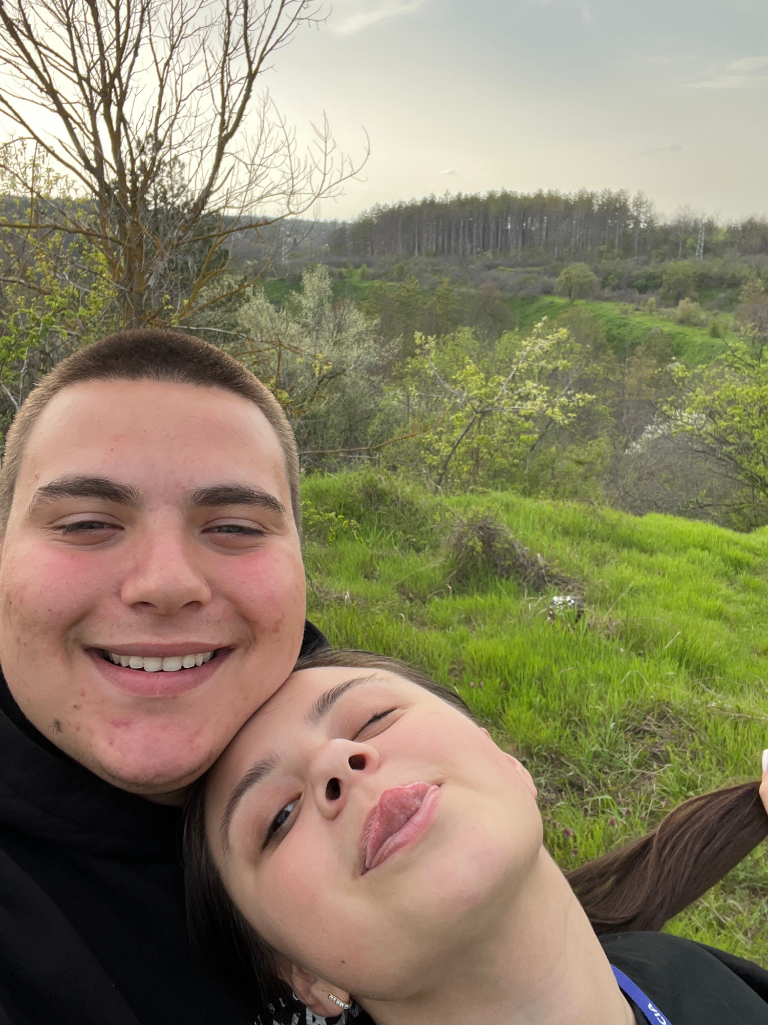 Two individuals pose closely for a selfie in what appears to be a natural setting. One individual, exhibiting a wide smile, is positioned at the bottom of the frame. The other, with their tongue playf…read more