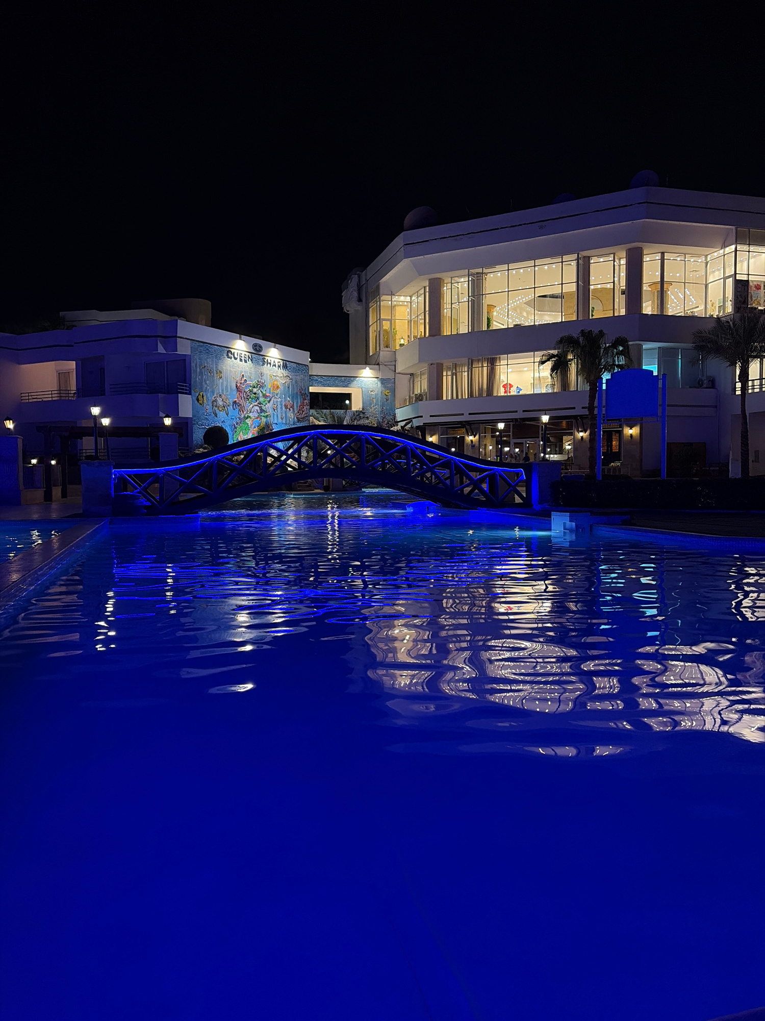 The image depicts a night scene in Sharm El Sheikh, Egypt, showing the "Queen Sharm" hotel. A pedestrian bridge with blue neon lighting arches over a body of water, reflecting the hotel's lights and t…read more