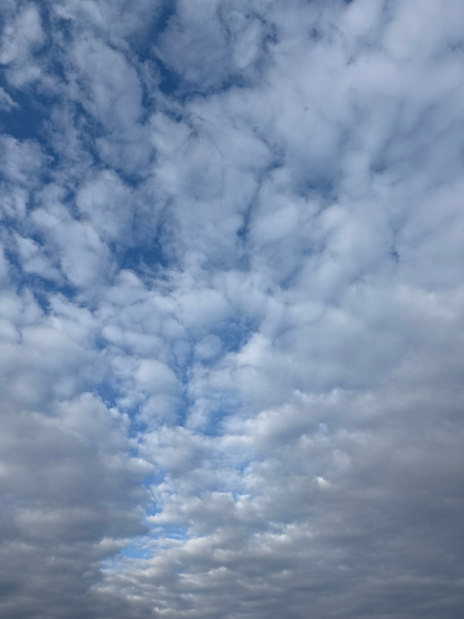 The image shows a daytime sky with a variety of cloud formations. On the left, the clouds are smaller, more defined, and separated by patches of blue sky. On the right, the clouds appear denser and mo…read more
