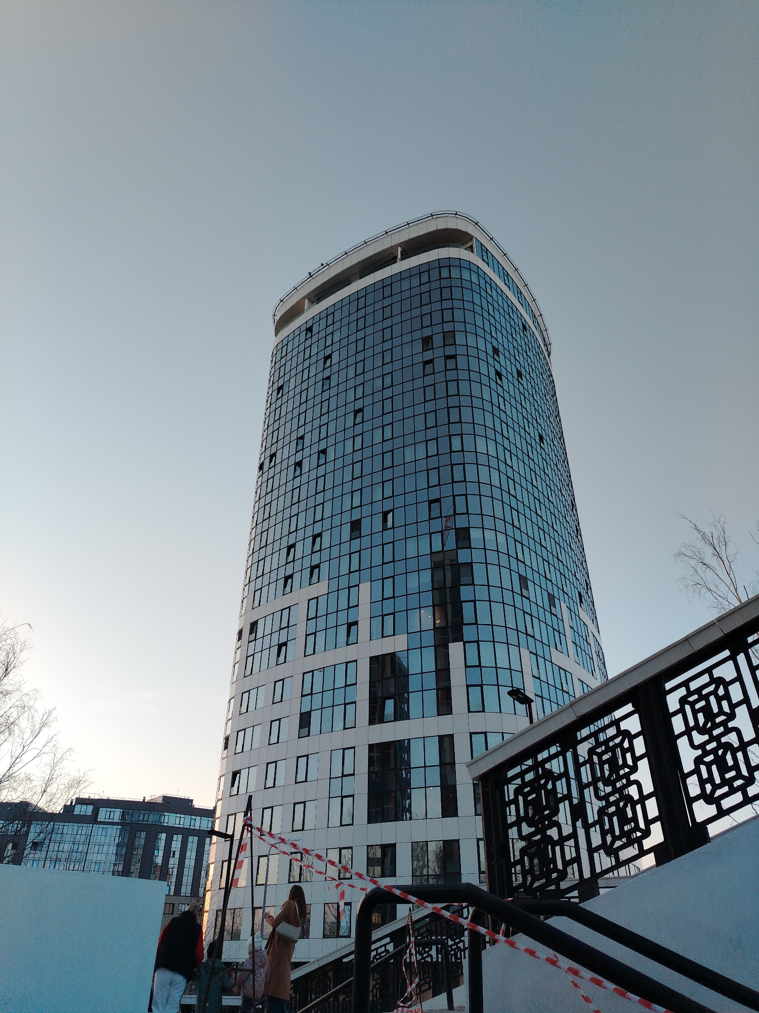 The image depicts the Izhevsk Plaza business center, also known as Respublika, located at 19 Pushkinskaya Street in Izhevsk, Udmurt Republic, Russia. The primary subject is a tall, modern, cylindricalβ¦read more