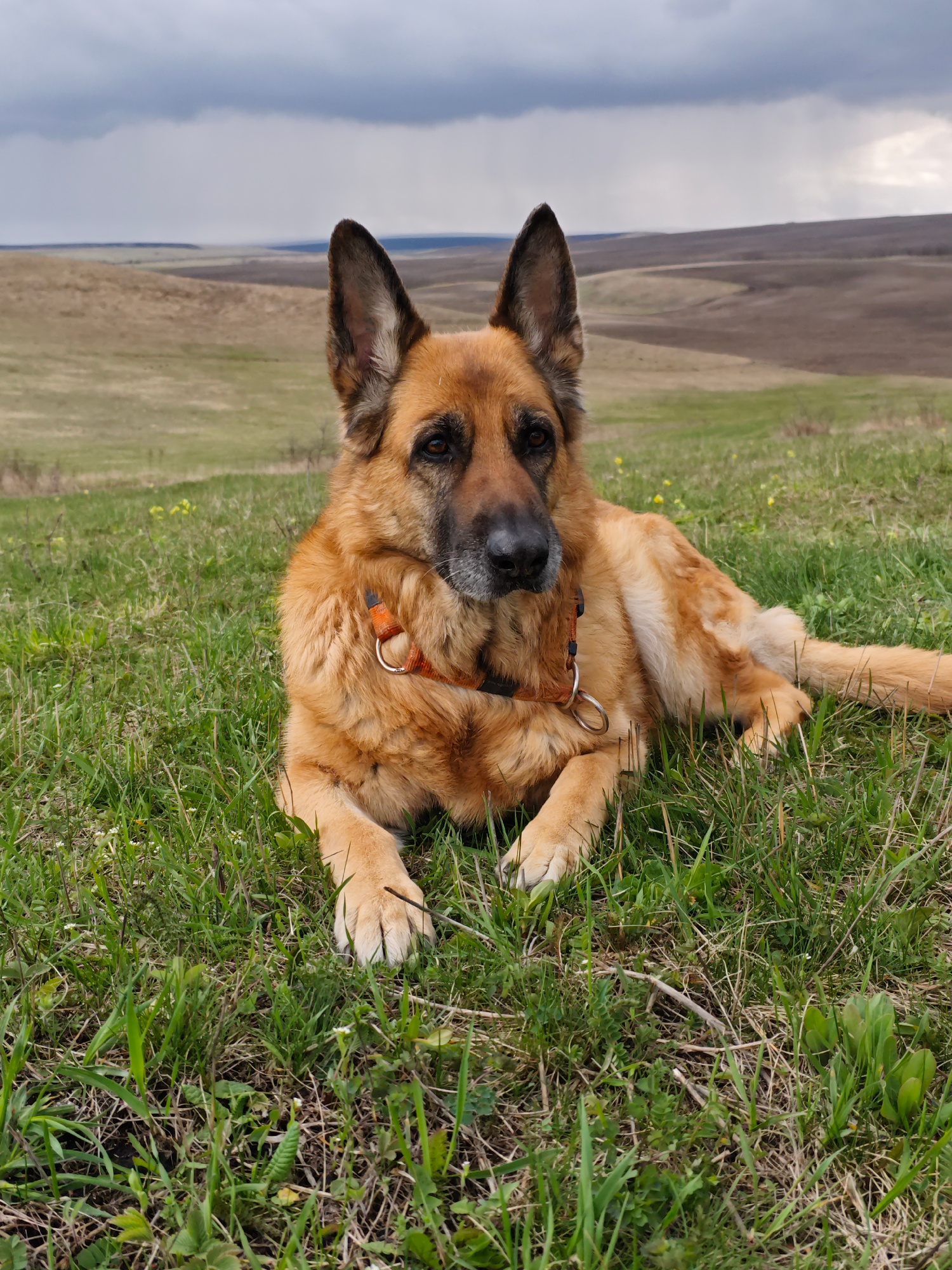 A German Shepherd dog is lying in green grass, facing slightly to the right, in what appears to be a rural setting. The dog has a reddish-brown and black coat and is wearing an orange harness with a m…read more