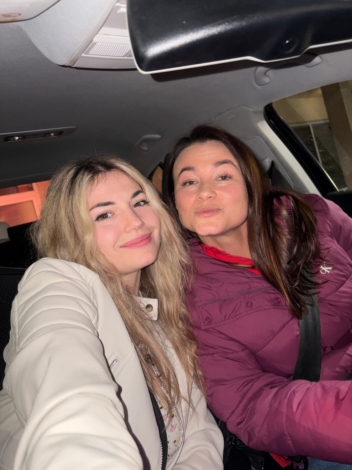 Two women are sitting in the front seats of a car, likely stationary, as both are wearing seatbelts. The woman on the bottom wears a light-colored jacket and has light blonde hair. The other woman is…read more