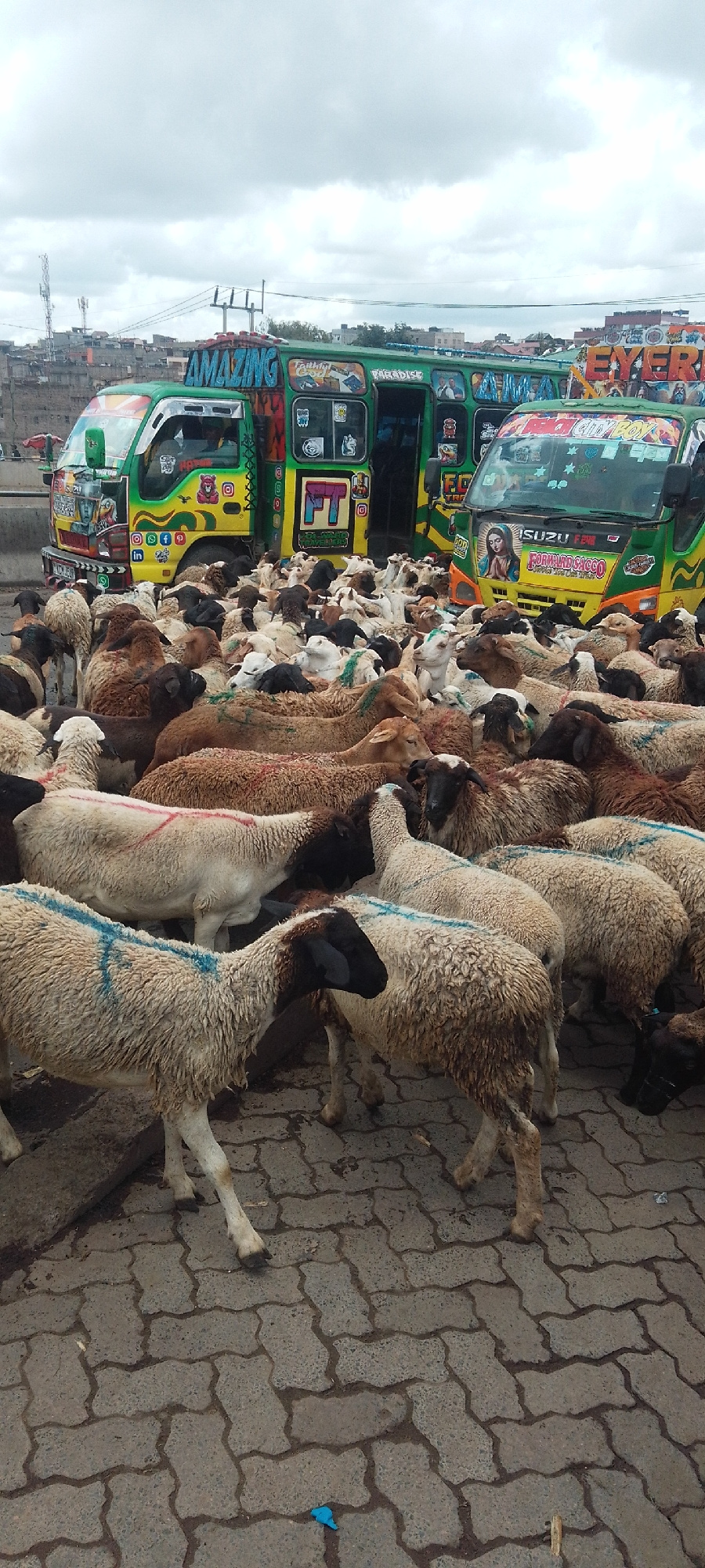 The photograph depicts a large gathering of sheep and goats in an urban environment, specifically near what appear to be matatus, a form of public transport, in Nairobi, Kenya. The sheep and goats are…read more