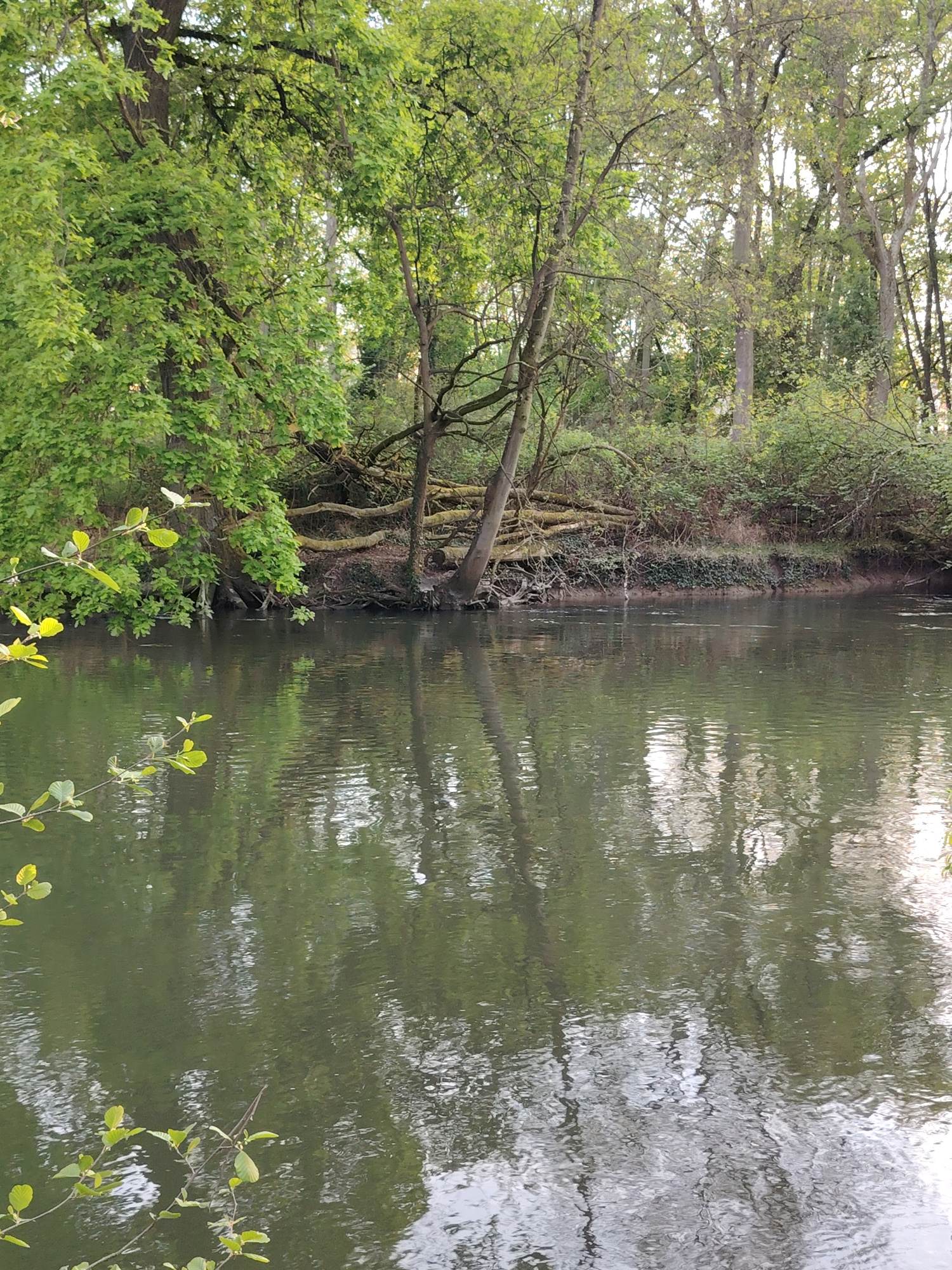 The image depicts a tranquil scene along a river or canal, likely located in Strasbourg, France, given the European foliage and architectural styles often found in the region. The water reflects the s…read more
