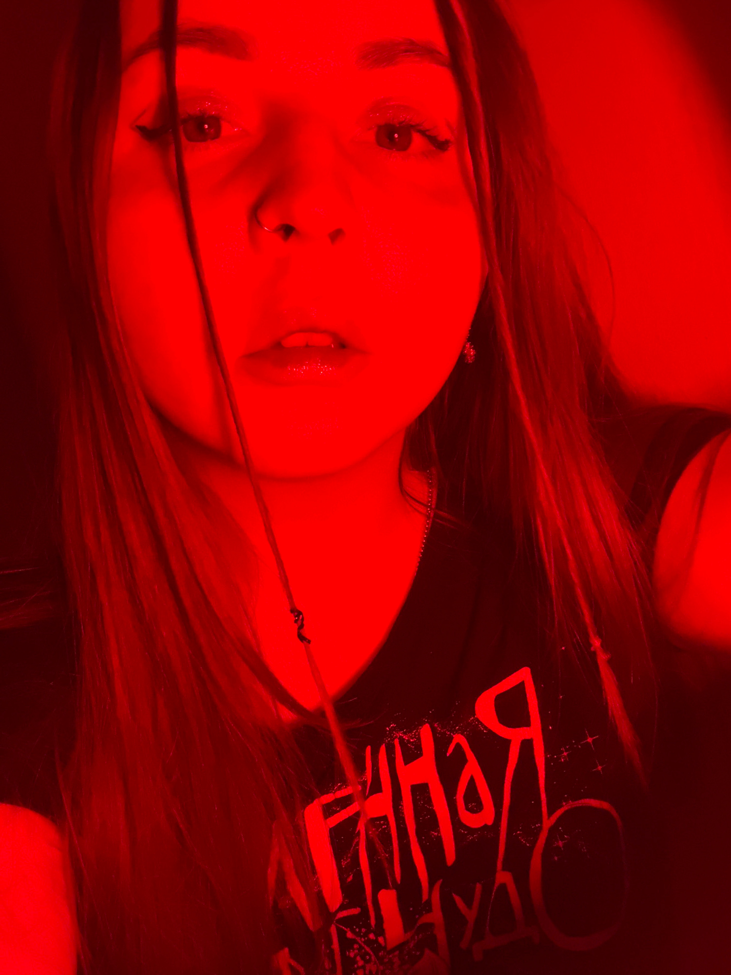 A woman lies on her back, her head tilted toward the viewer. She has long, reddish hair and fair skin. Her eyes are open, and she has a nose ring. A thin string crosses her face, passing between her e…read more