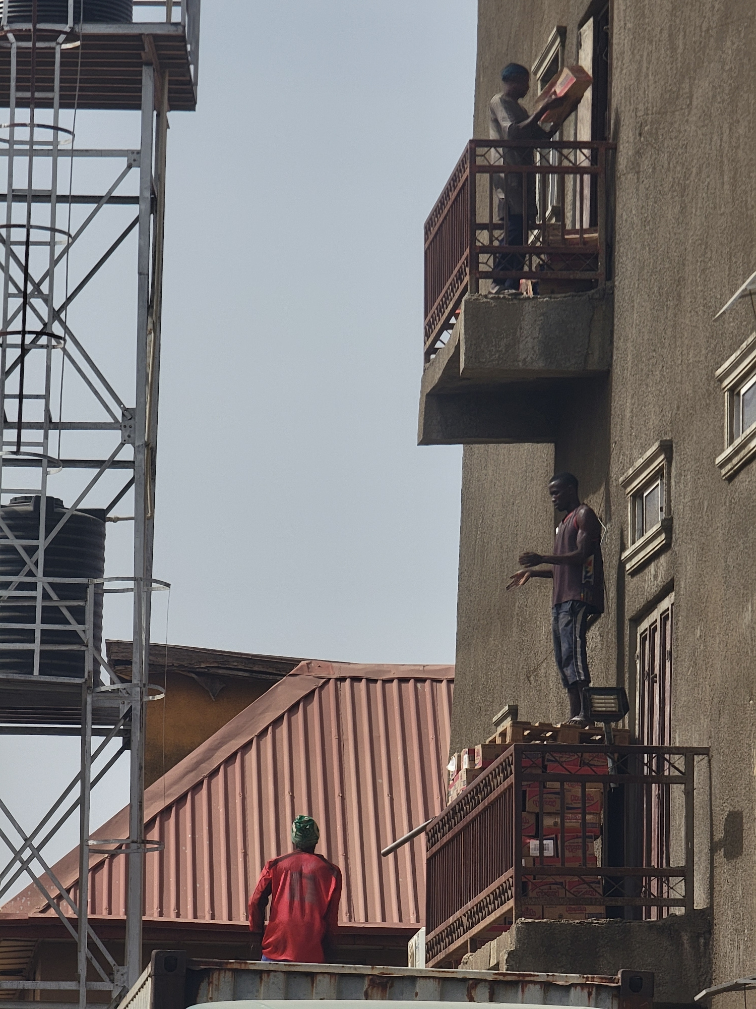 The scene shows a street scene in Maiburiji, Nigeria, with multiple buildings and people. On the upper left, a person wearing a blue head covering leans out from a balcony holding a pink object. Adjacent to this, a man in a t-shirt and shorts leans out from a higher level balcony, extending his arms. Further right, a balcony is stacked with boxes. On the right of the image, a person wearing a red shirt and green hat stands on a corrugated roof. In the foreground, a metal scaffolding structure is visible. The sky is pale and clear. | Open Wire
