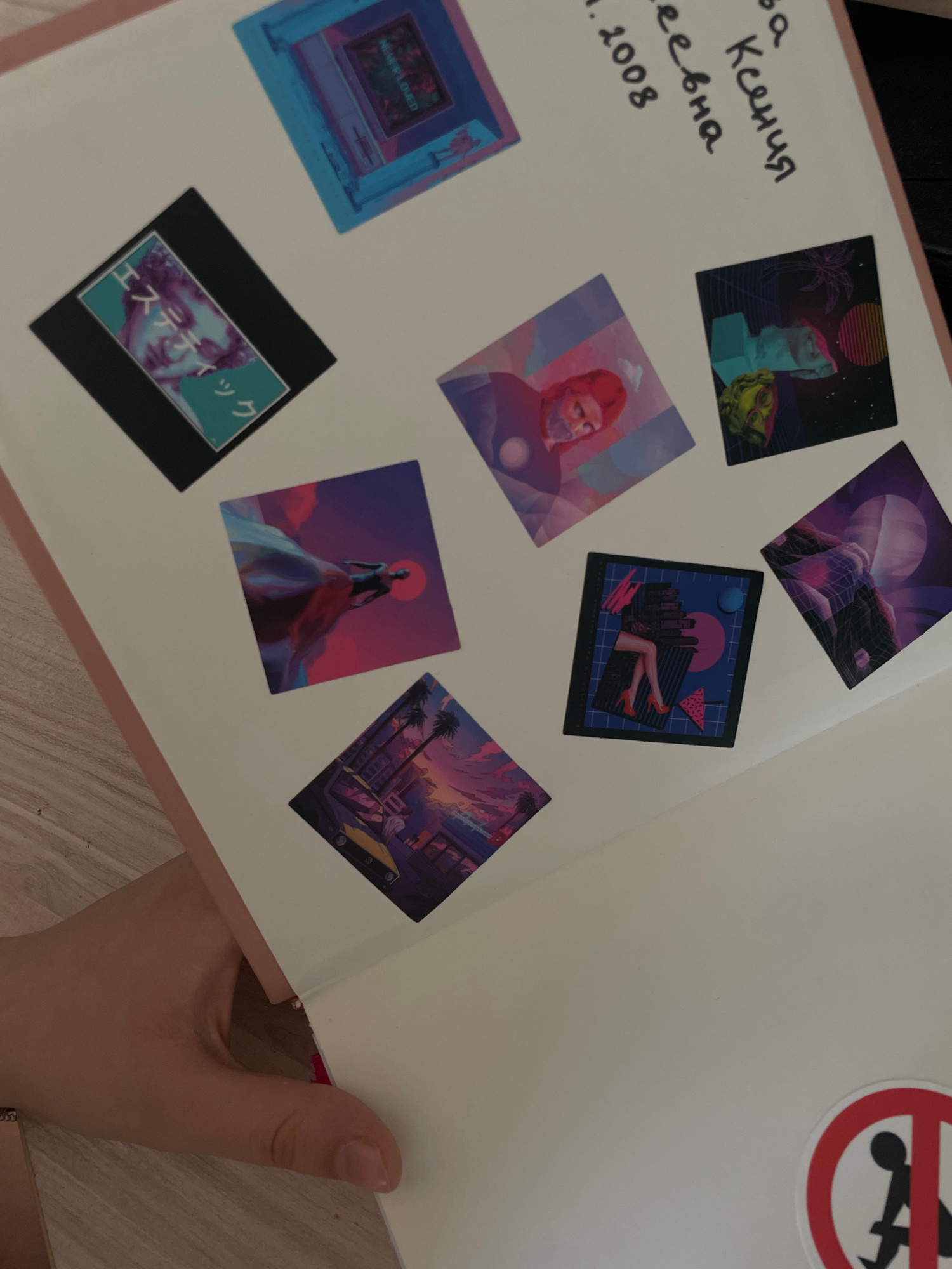 An open notebook or diary, with light-colored pages, is presented in a close-up, high-angle shot. The main focus is on a collection of seven aesthetic stickers adhering to the left page, along with so…read more