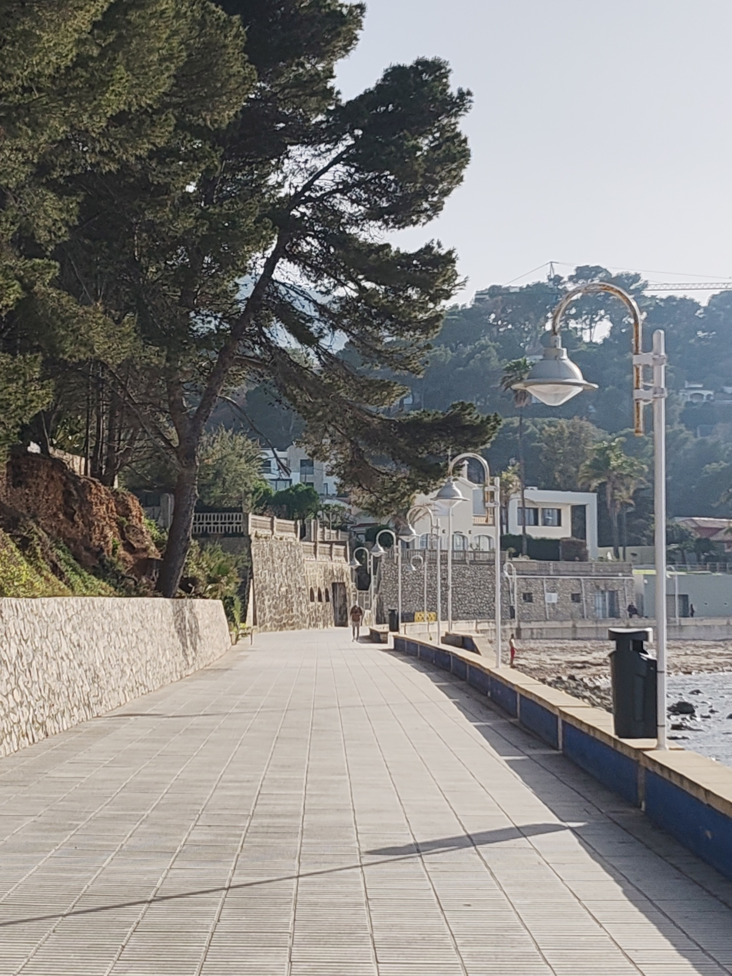 The image depicts a seaside promenade in Dénia, Spain. The foreground features a wide, tiled walkway running along the coastline. To the left, a stone wall runs parallel to the path, with a steep, woo…read more