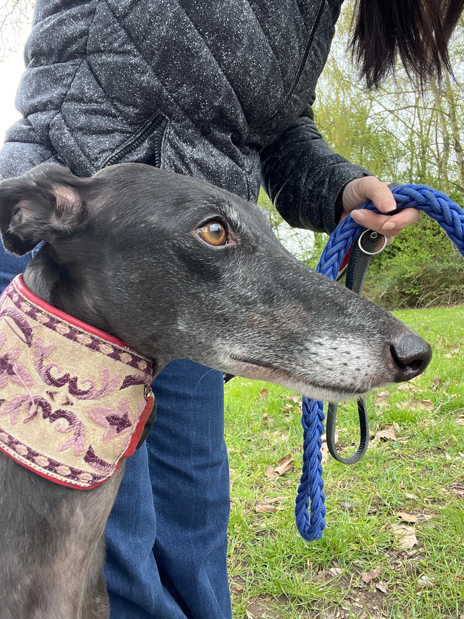 A grey-muzzled, black-furred dog wearing a decorative beige and purple collar is the primary subject of the image. The dog is positioned at the top of the frame, with its head oriented downwards. The…read more