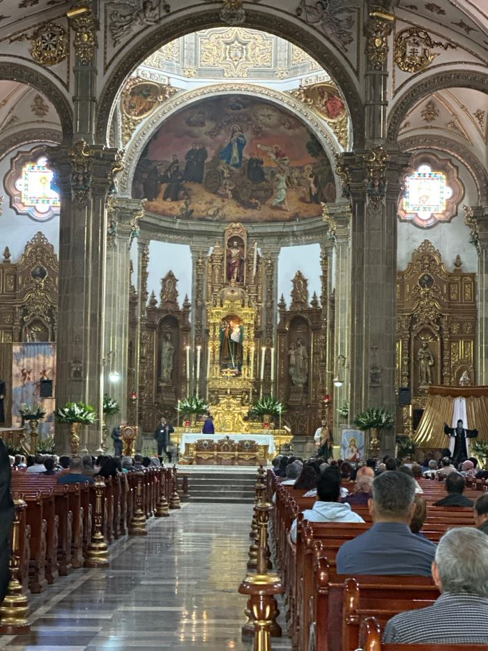The image displays the interior of the Santuario de Nuestra Señora de Los Ángeles (Sanctuary of Our Lady of the Angels) in Mexico City, Mexico. The perspective is from the nave, looking directly towar…read more