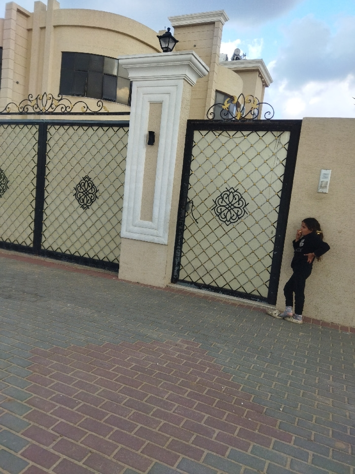 The image captures an exterior view of a modern house and its entrance gate, with a young girl standing nearby. The scene is set during the daytime under a partly cloudy sky. The main subject is a la…read more