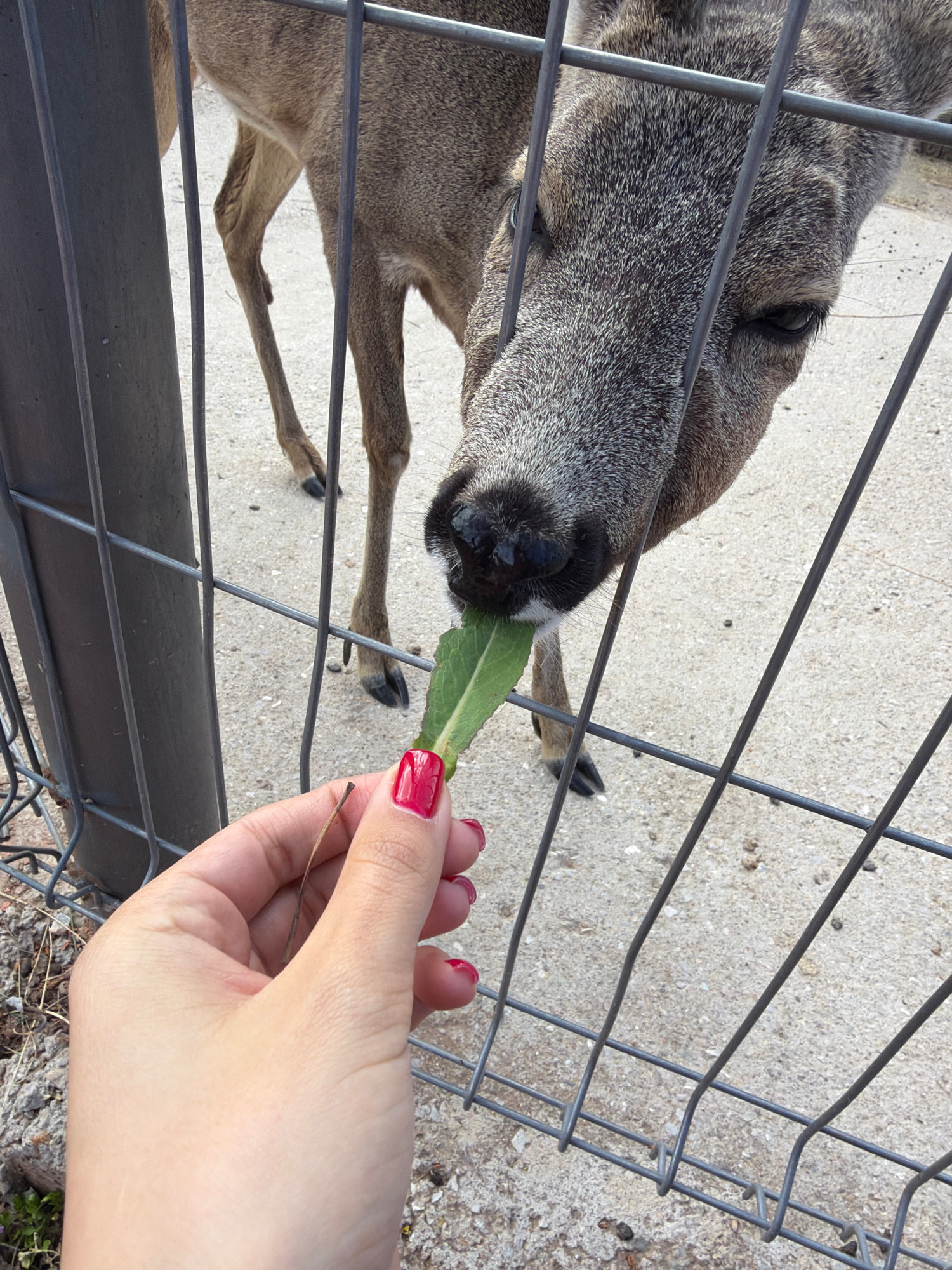 A person is feeding a deer a green leaf through a wire fence. The deer is close to the fence, its nose and mouth visible as it takes the leaf. The person's hand is extended, holding the leaf out. The…read more