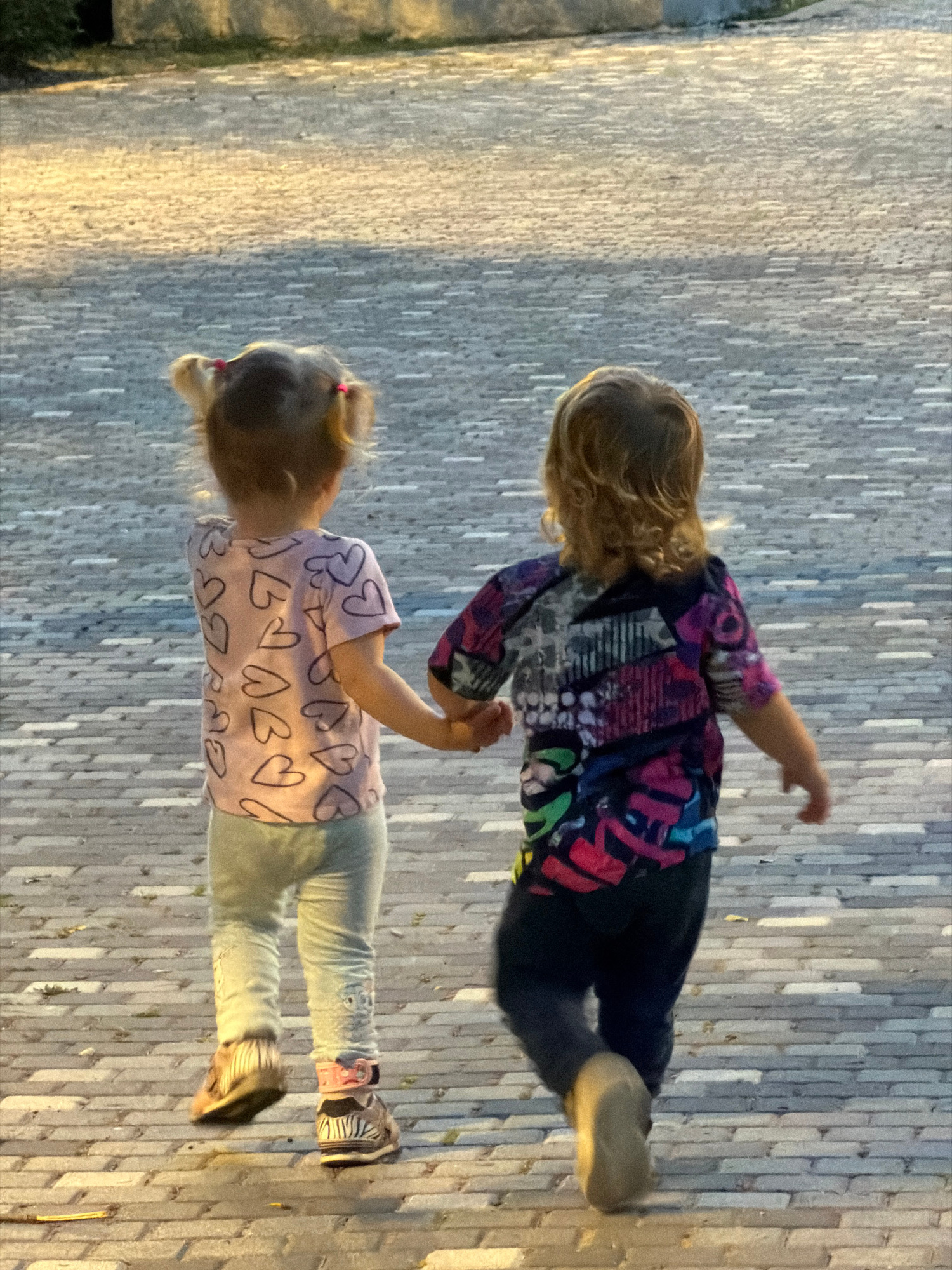 Two young children are walking on a paved walkway, likely in Kiryat Bialik, Israel. The walkway is made of light-colored, rectangular paving stones arranged in rows. One child is wearing a colorful lo…read more