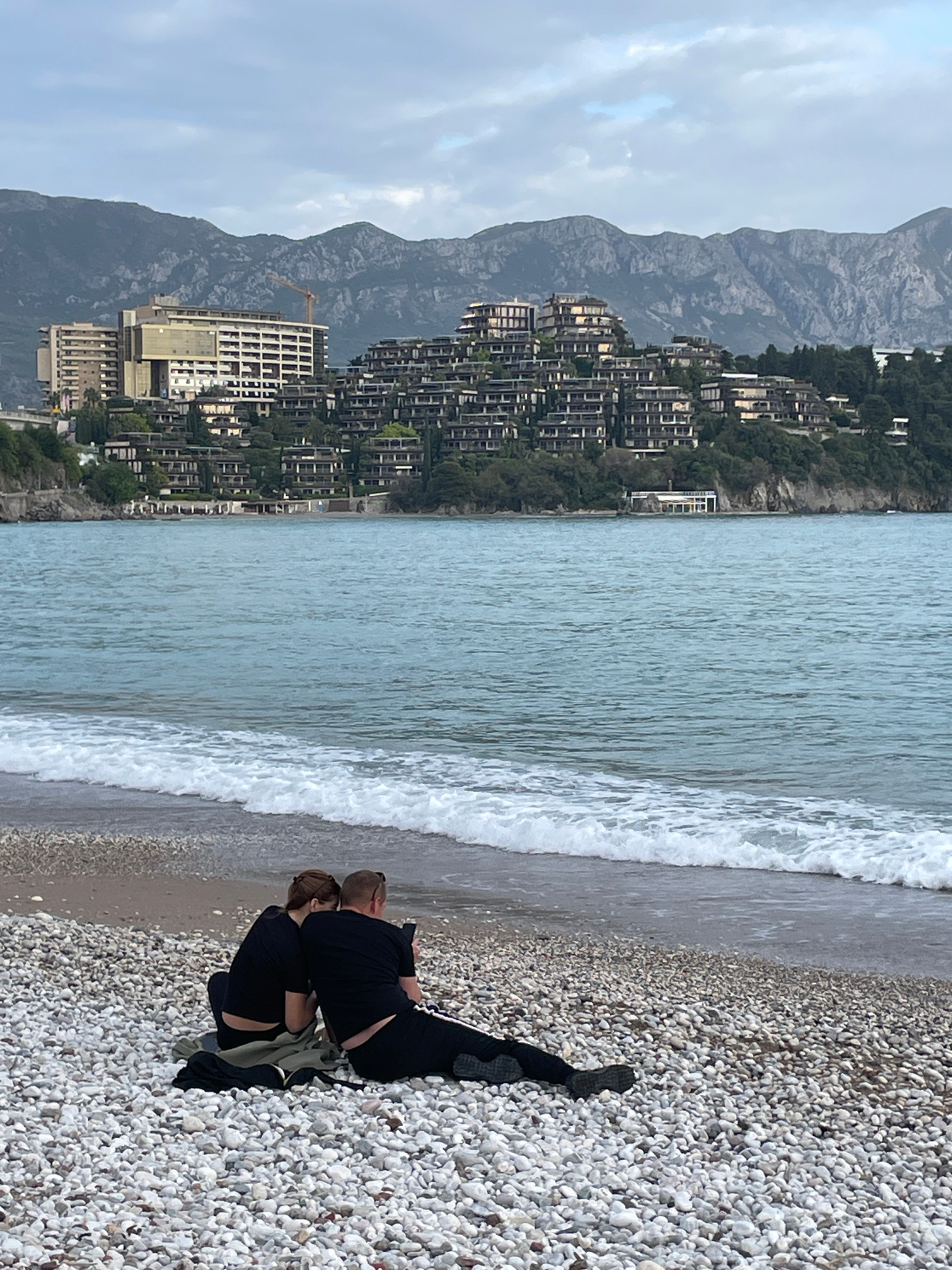 The image depicts a beach scene in Budva, Montenegro. The beach is composed of small white pebbles. A man and a woman are crouched down on the beach, seemingly interacting or looking at something. Beh…read more