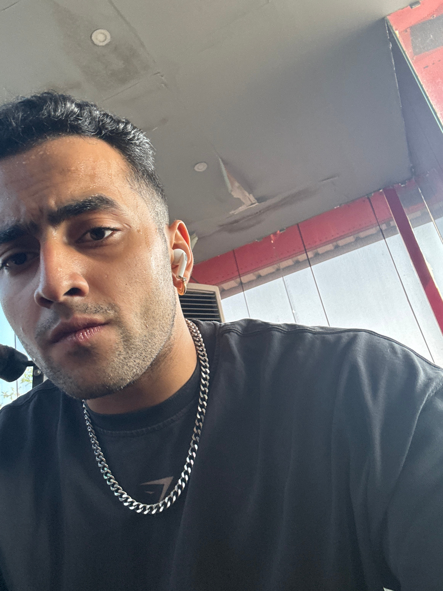 A low-angle medium shot depicts a man wearing a black t-shirt and a silver chain necklace. He has short, dark hair and stubble, with an earbud in his right ear. The background shows a building exterio…read more