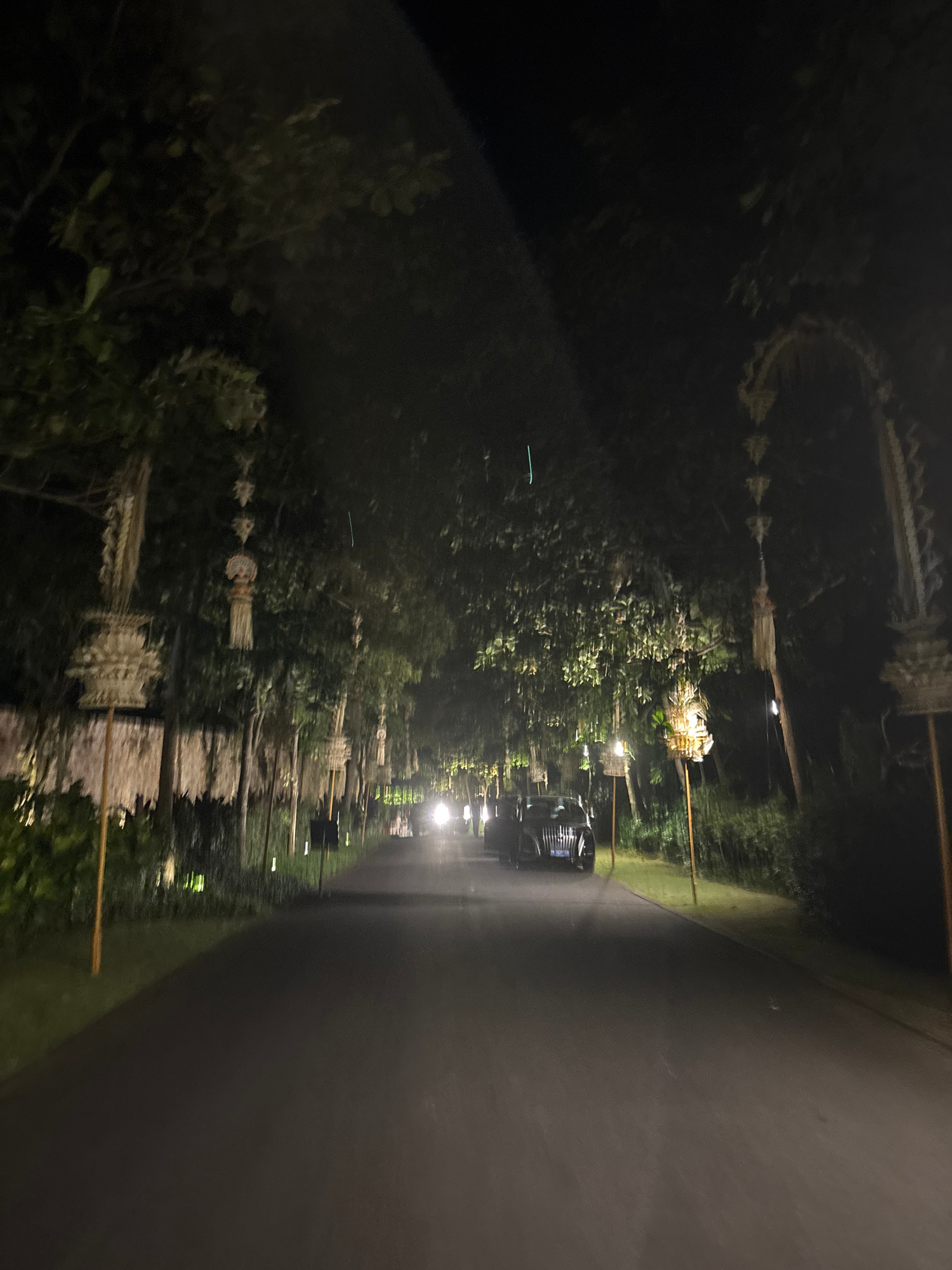 An overhead-style view captured at night depicts a paved pathway bordered by a grassy verge and dense tropical foliage, with the location being Kuta Selatan, Indonesia. The image is primarily dark, il…read more