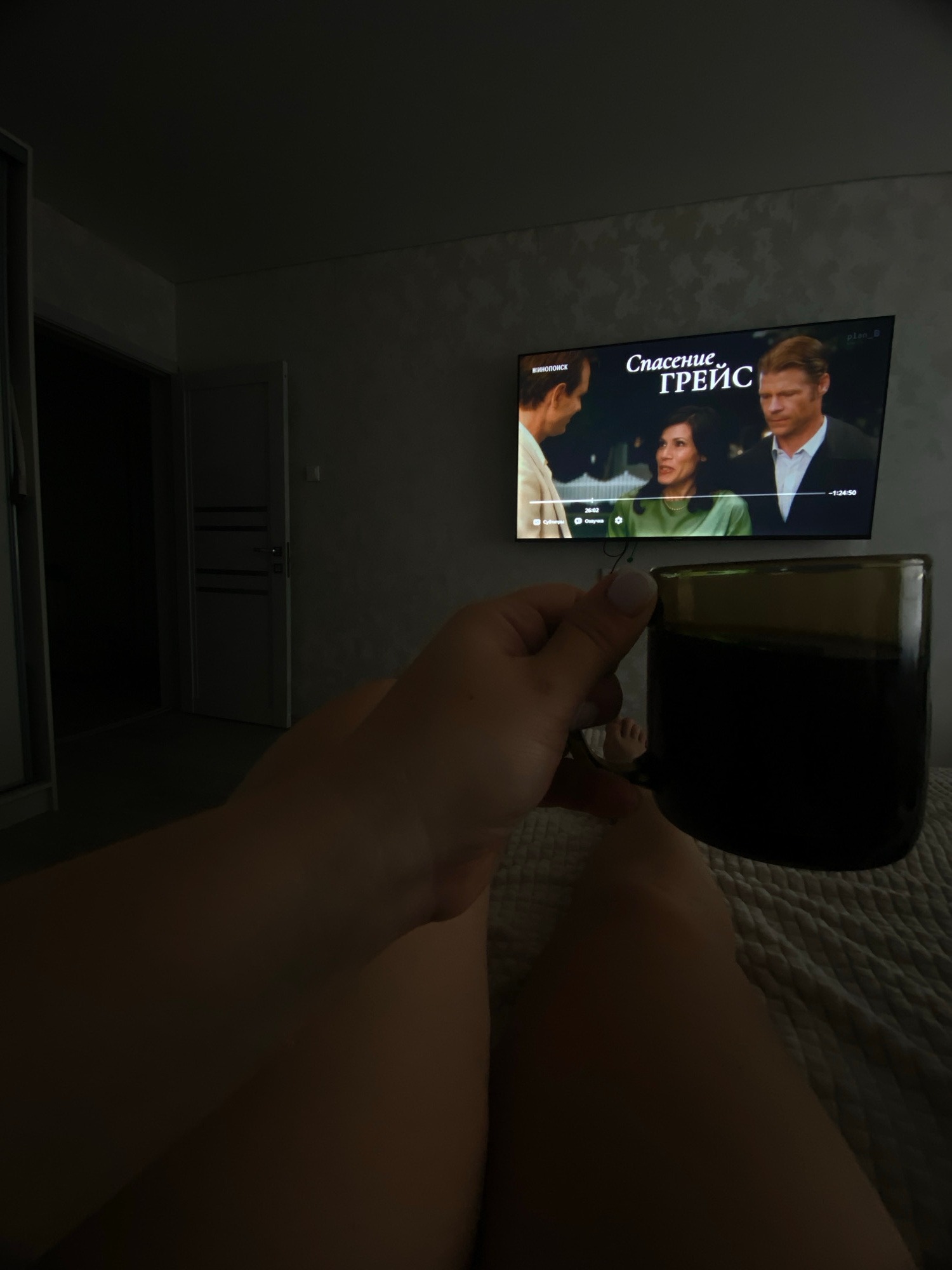A person sitting on a bed holds a mug in front of a television screen displaying the title "Спасение ГРЕЙС" (Saving Grace). A cabinet and what appears to be a door are visible in the lower portion of…read more