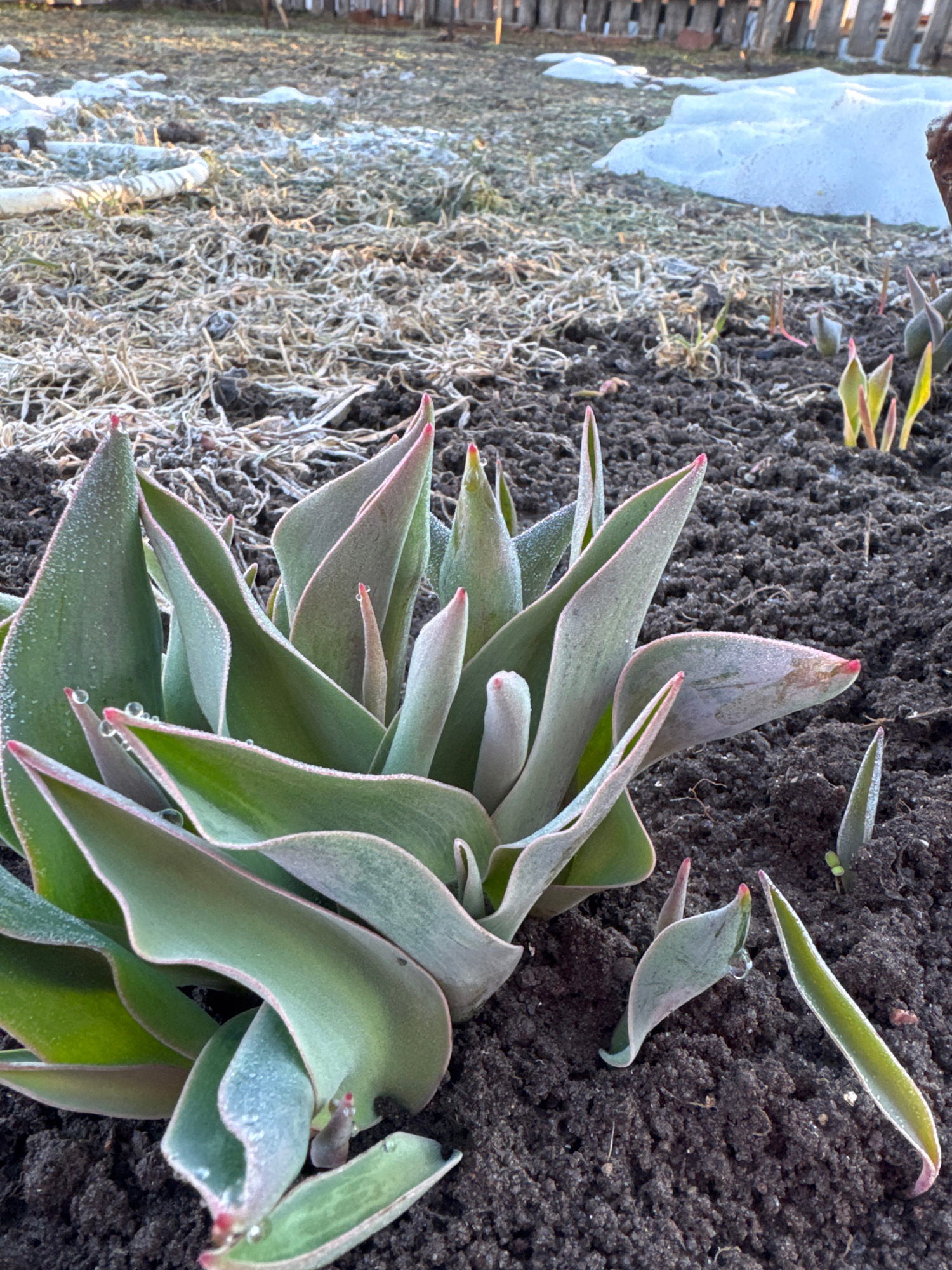 The image depicts a garden bed in what appears to be early spring, likely in a residential area. A cluster of young tulip plants with green and grey-tinged leaves, edged with pinkish-red, are the cent…read more