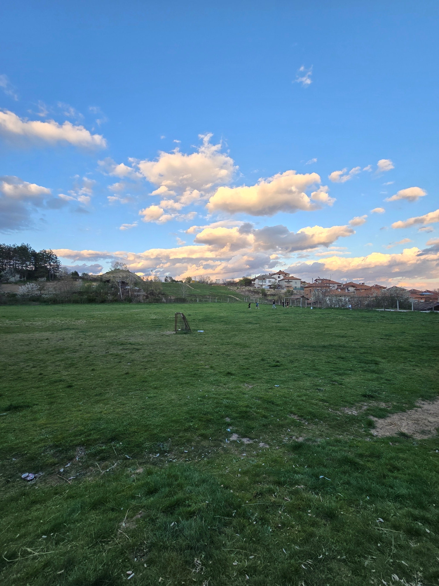 A horizontal landscape photograph shows a bright blue sky dotted with fluffy, white clouds tinged with gold from the setting sun. The sky transitions into a green field occupying the majority of the s…read more