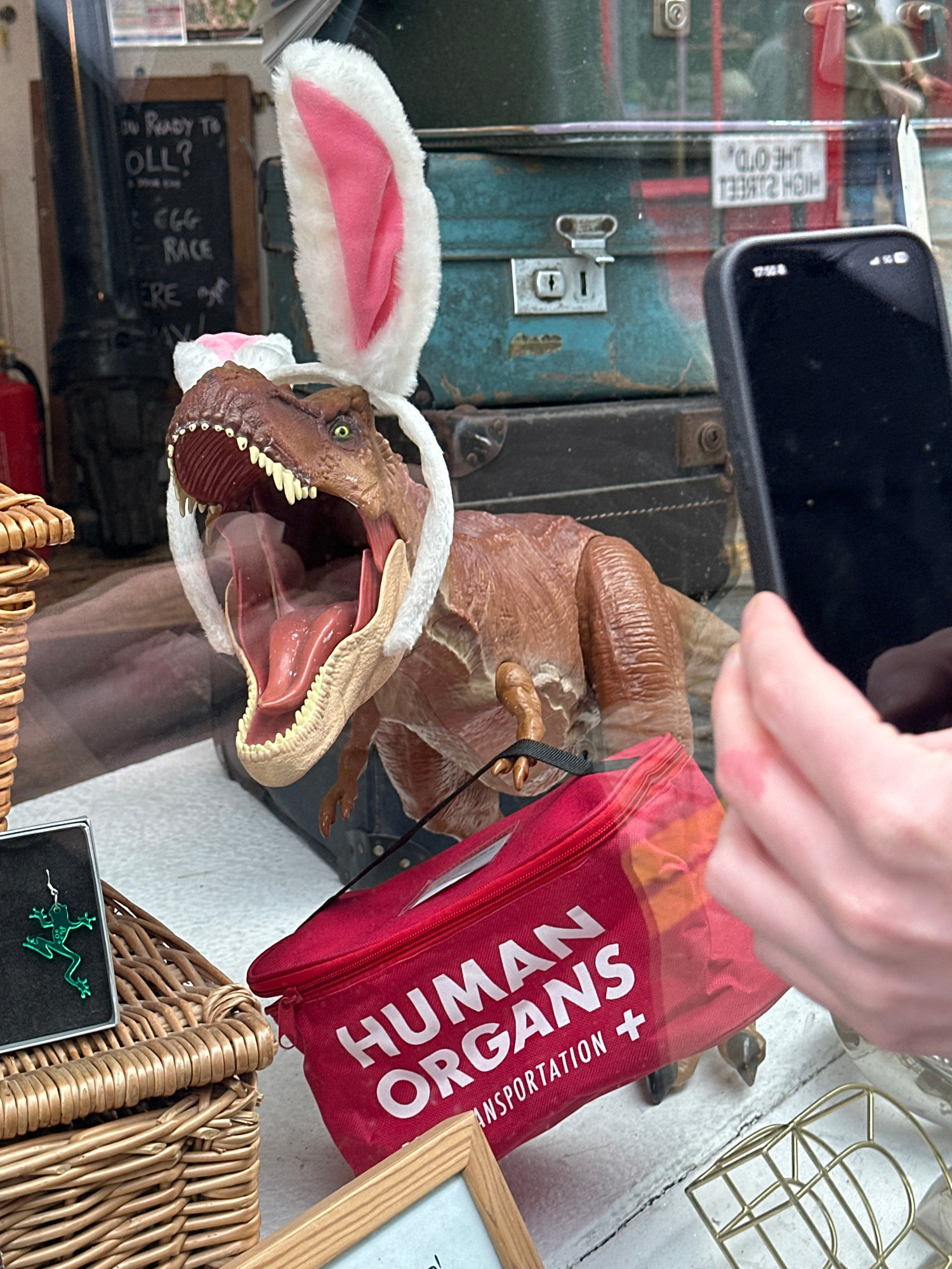 This image shows a variety of objects on a reflective surface, possibly a glass tabletop, suggesting a display or collection of items. The objects include a Tyrannosaurus Rex toy wearing bunny ears, a…read more