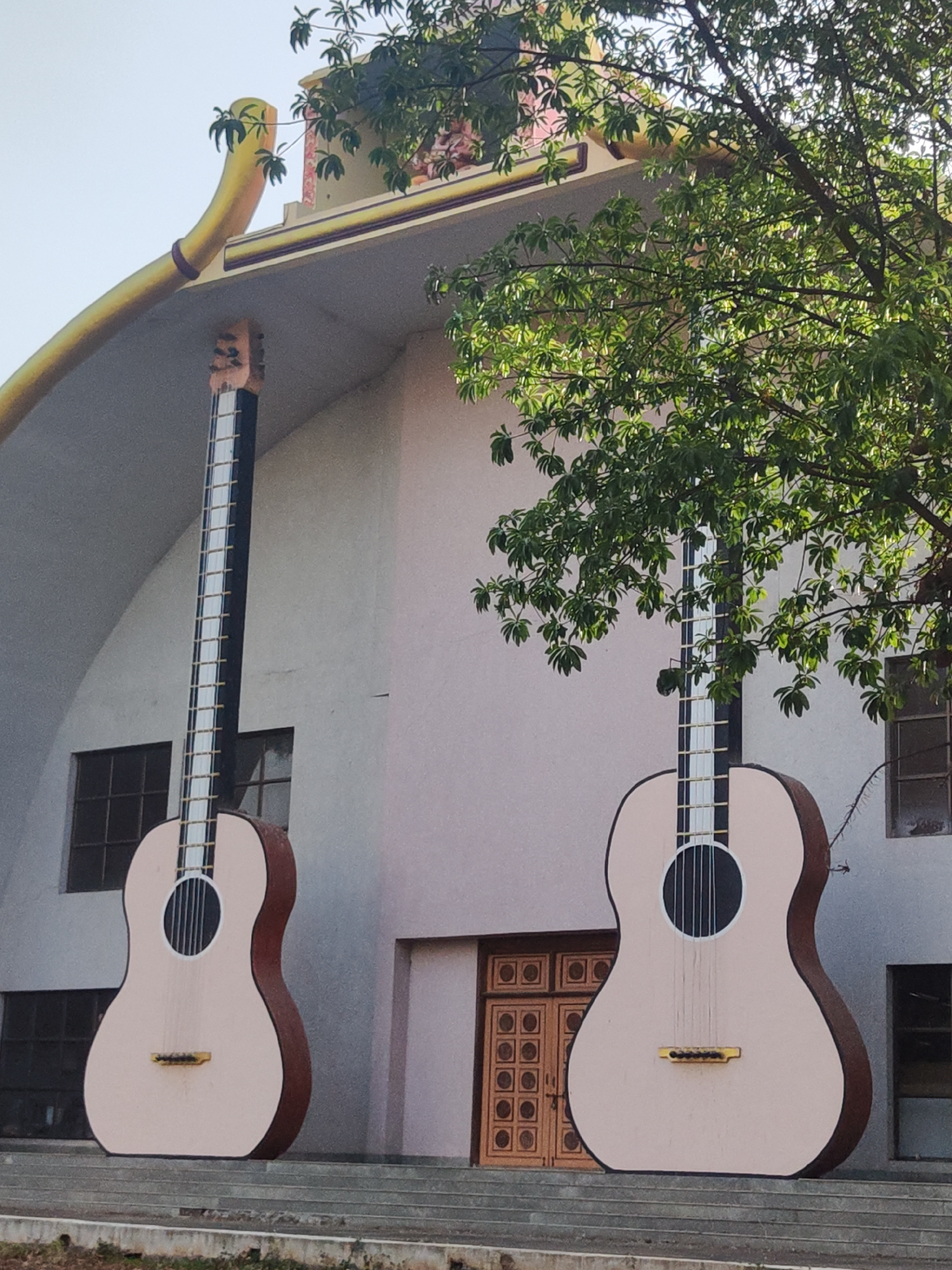 Two large guitar decorations adorn the exterior of a building in Puttaparthi, India. The upper guitar is positioned horizontally, with the body facing right. Below it, the second guitar is also horizo…read more