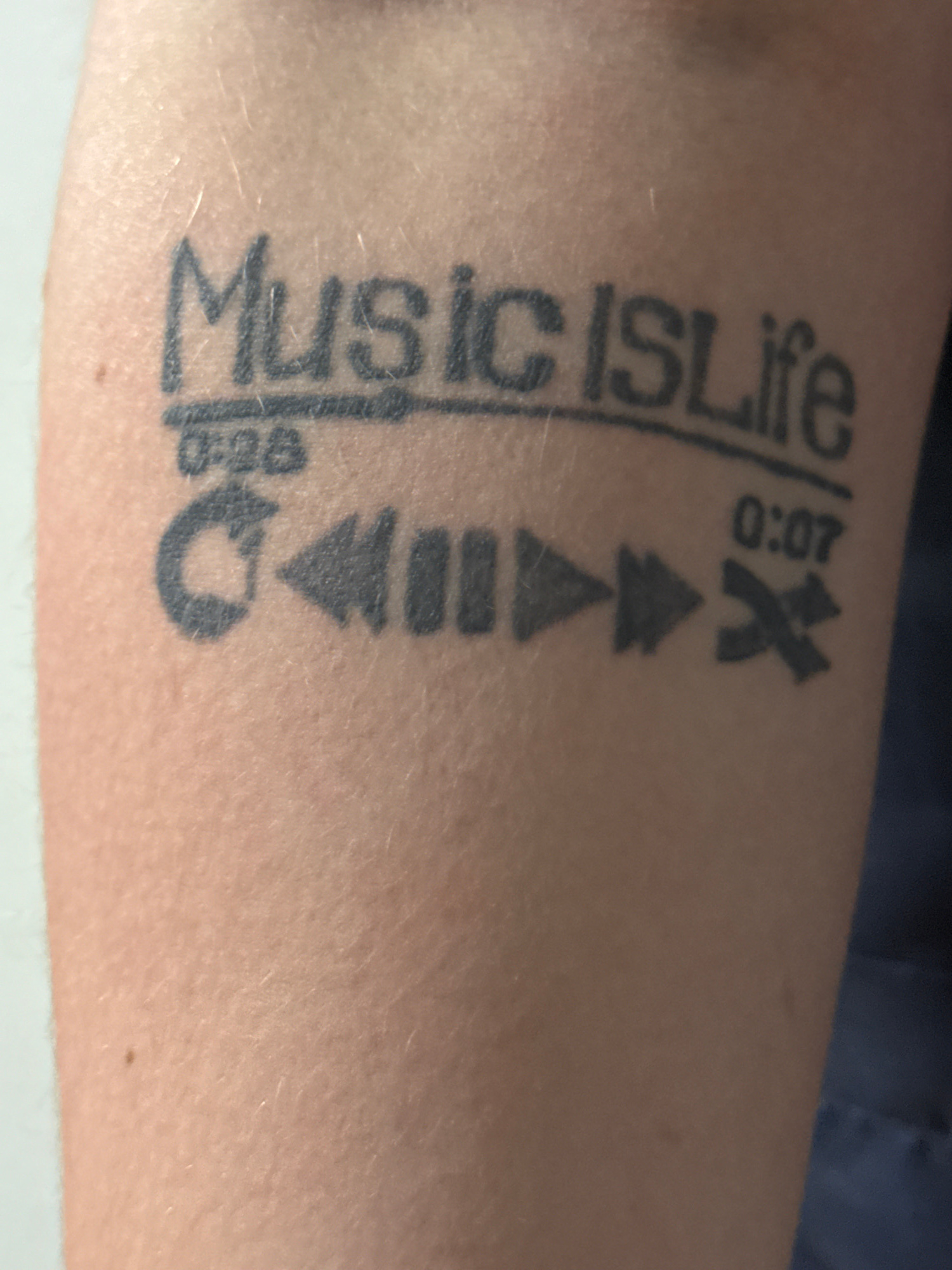 A person's forearm with a black ink tattoo is visible. The tattoo features the text "Music IS Life" with a horizontal line underneath. Below this line, the text "0:06" is present. Further down, a seri…read more