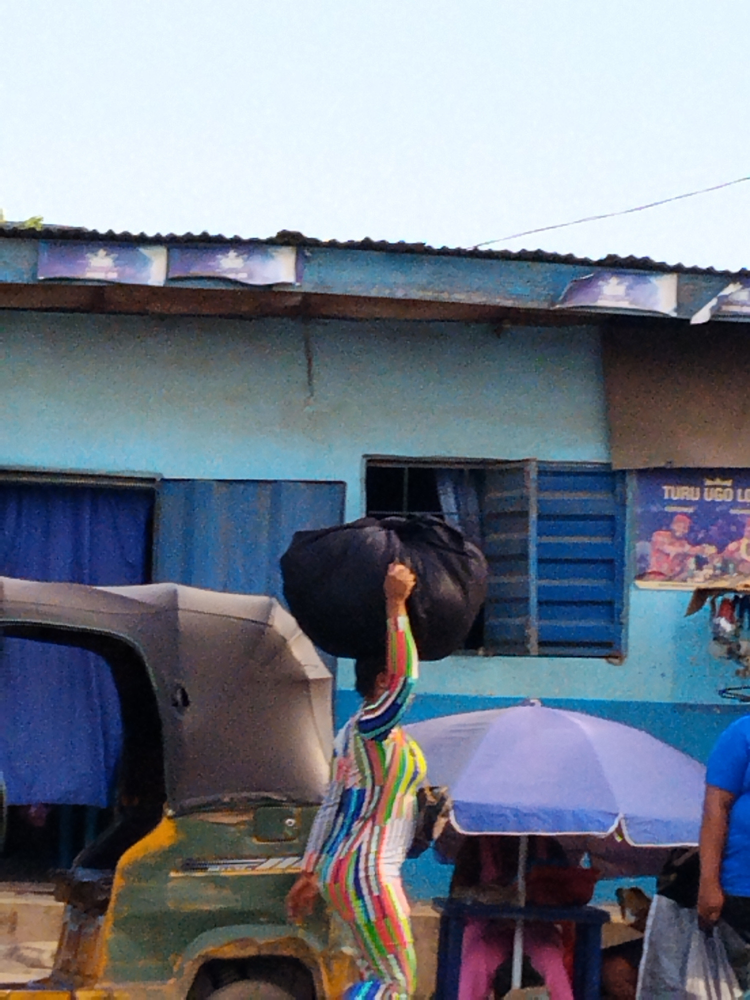 A woman in a colorful, striped jumpsuit is carrying a large black bag on her head in Aba, Nigeria. She is standing in front of a light blue building with a corrugated metal roof. A green and yellow th…read more
