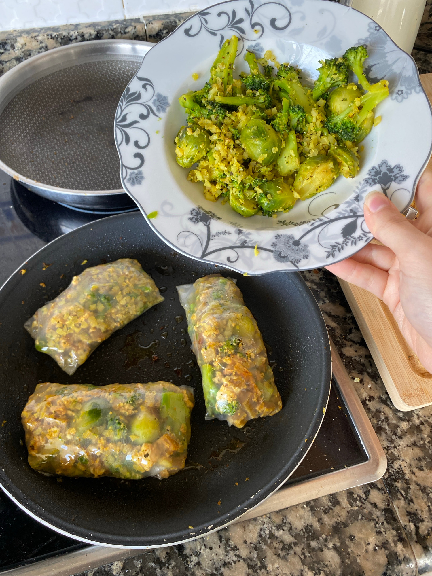 A close-up, eye-level shot captures a cooking scene in a kitchen. The main subjects are a plate of cooked vegetables, a hand holding the plate, and a frying pan containing wrapped food items. In the…read more