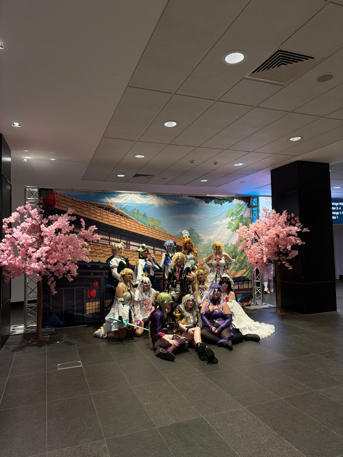 This image depicts an indoor group photograph of approximately 18-20 individuals, predominantly female, dressed in elaborate cosplay costumes, positioned within the Manchester Central Convention Compl…read more