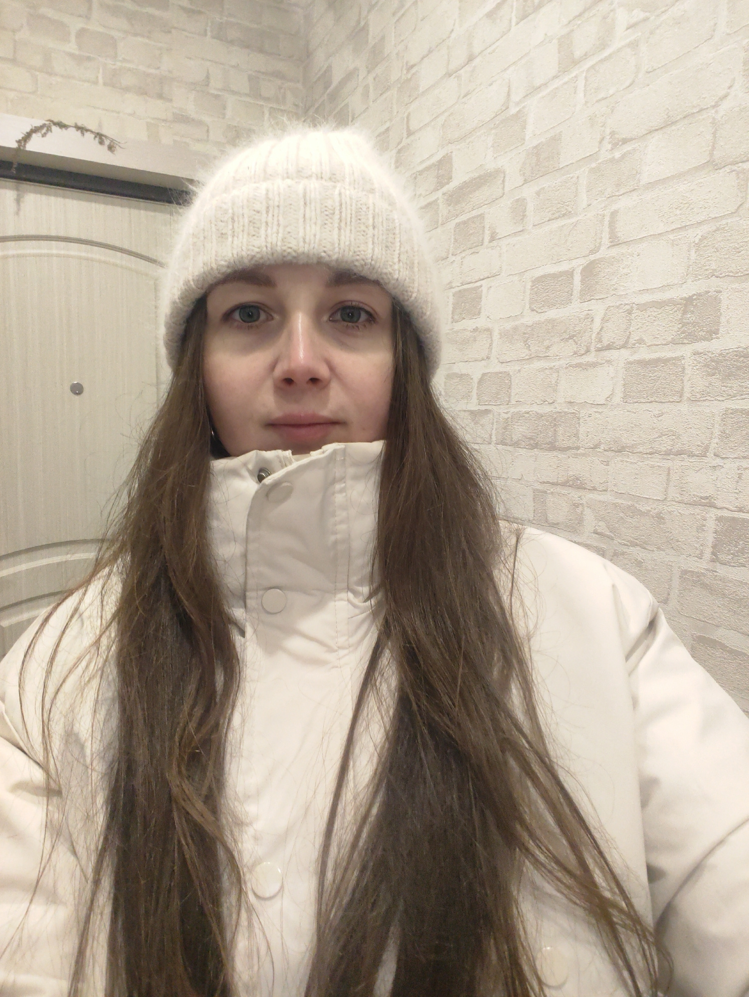A waist-up indoor shot of a woman wearing a white knitted hat and a white puffer jacket. She has long brown hair. The background is a light-colored brick wall and a closed light-colored door. Location…read more