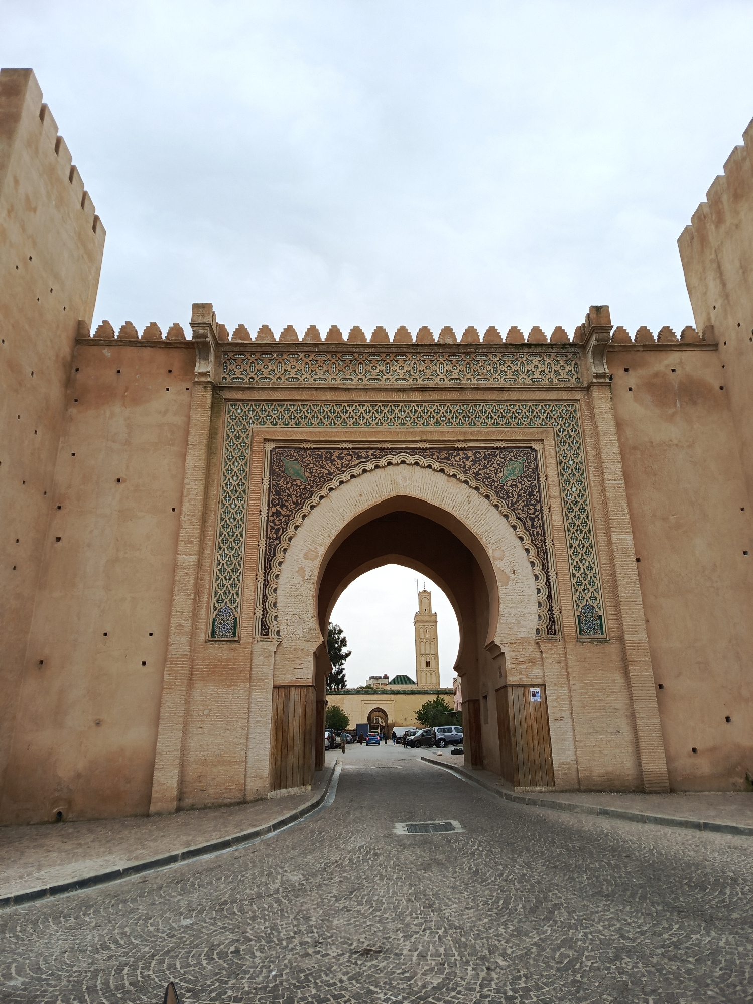 The image depicts Bab Mansour, a monumental gate in Meknes, Morocco. It is constructed of sandstone and features intricate tilework above the arched entrance. The road leading through the gate is pave…read more