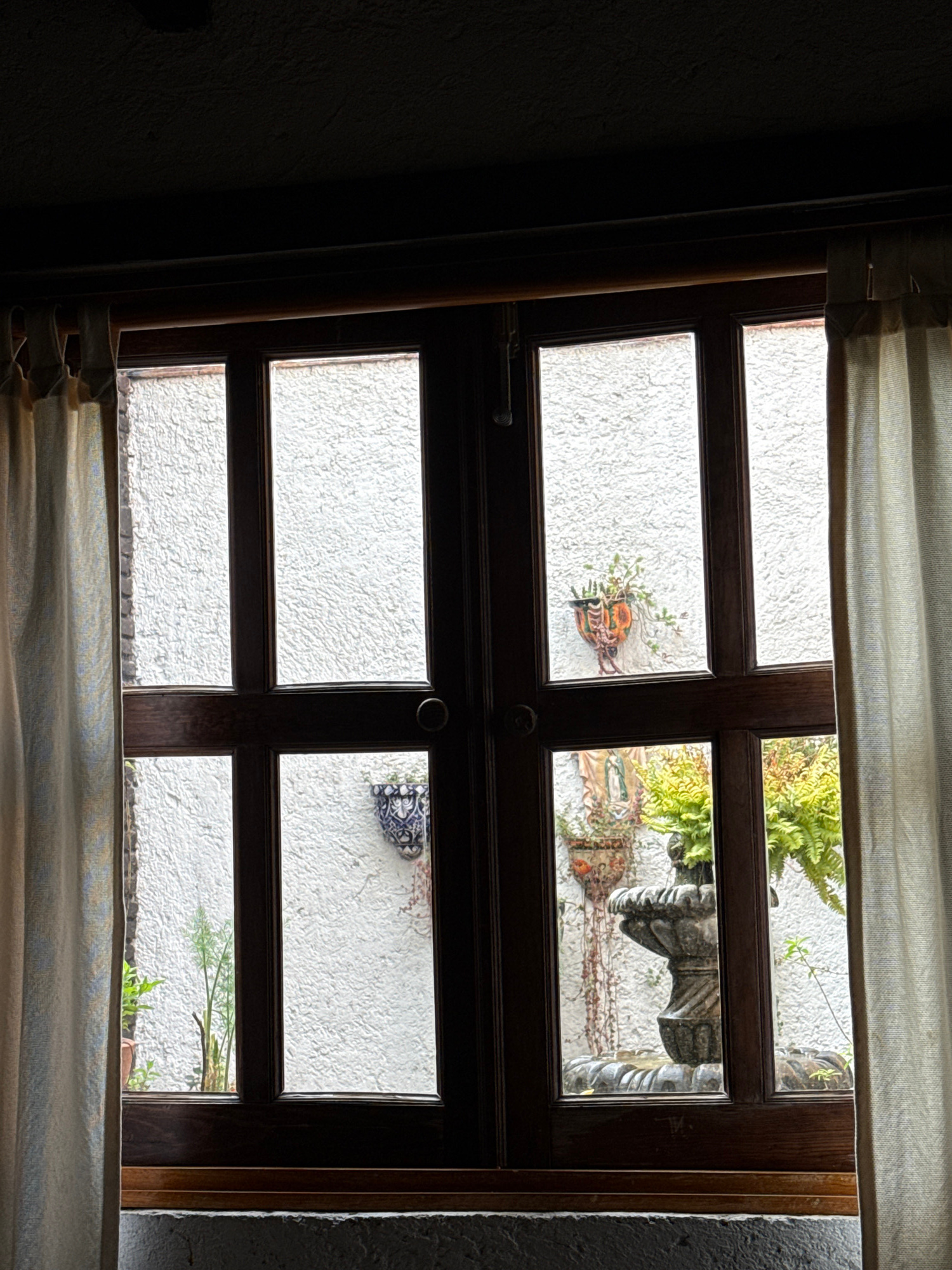 A dark, partially obstructed view through a wooden-framed window is observed. The window is divided into multiple panes and is partially covered by light-colored curtains at the top and bottom. Outsid…read more
