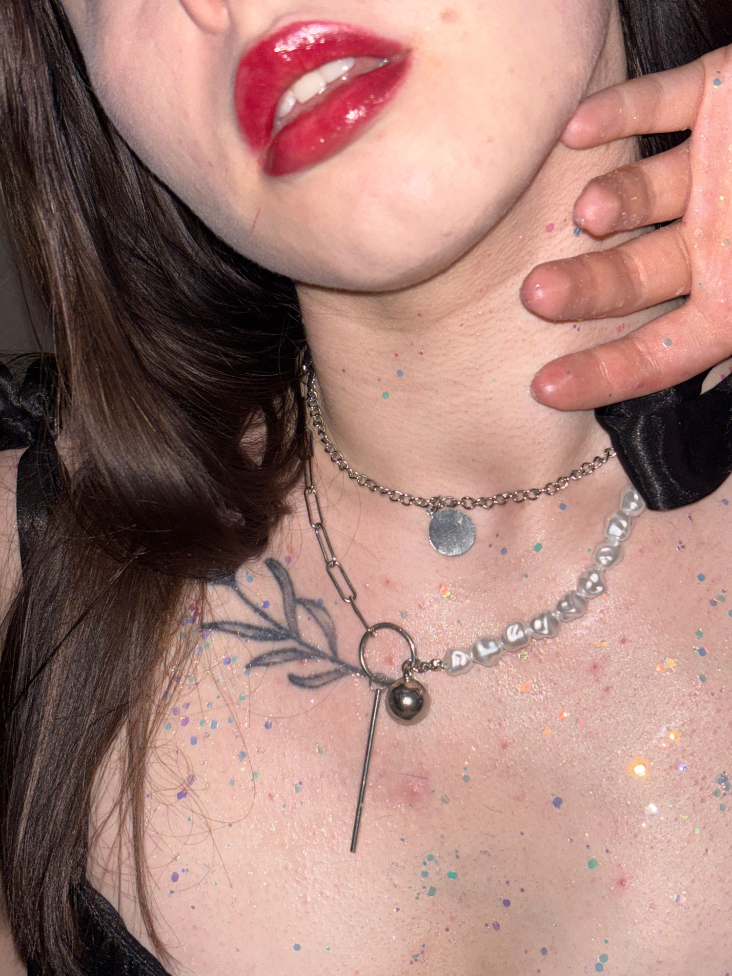 The image depicts a close-up of a person lying down. Their head is tilted, exposing their face, neck, and upper chest. The person has red lipstick and brown hair. They are wearing a pearl necklace, a…read more