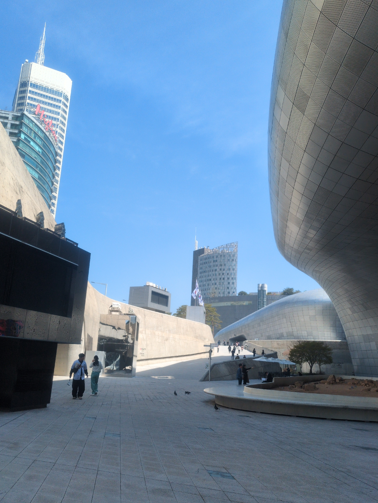 The image depicts an urban scene in Seoul, South Korea, featuring the Dongdaemun Design Plaza (DDP). The DDP's futuristic, curvaceous architecture dominates the view. The sky is a clear, bright blue.…read more