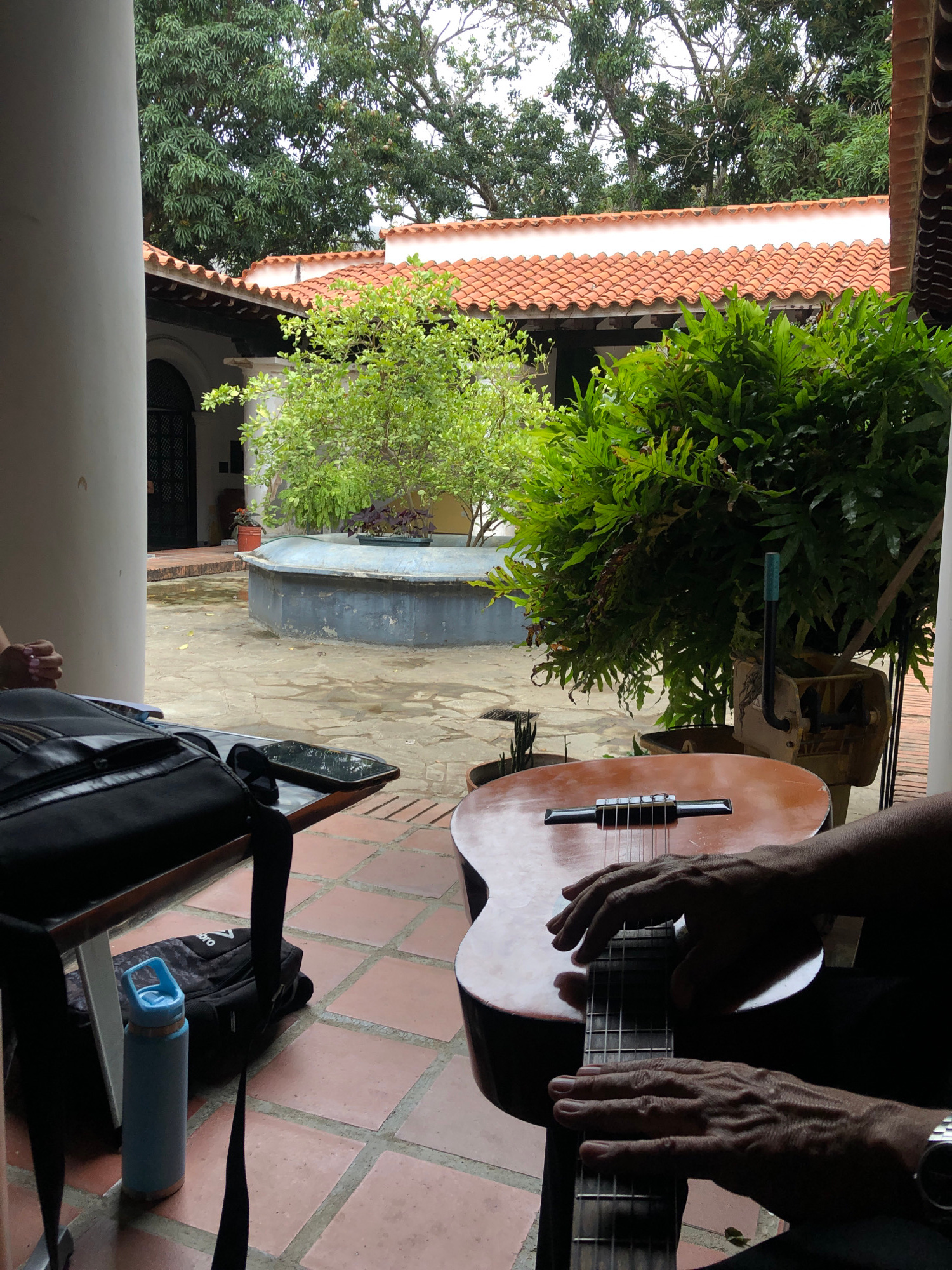This image, rotated 90 degrees clockwise, captures an outdoor scene, likely a patio or courtyard, in El Valle del Espíritu Santo, Venezuela. In the top right quadrant, a person's hands are actively pl…read more