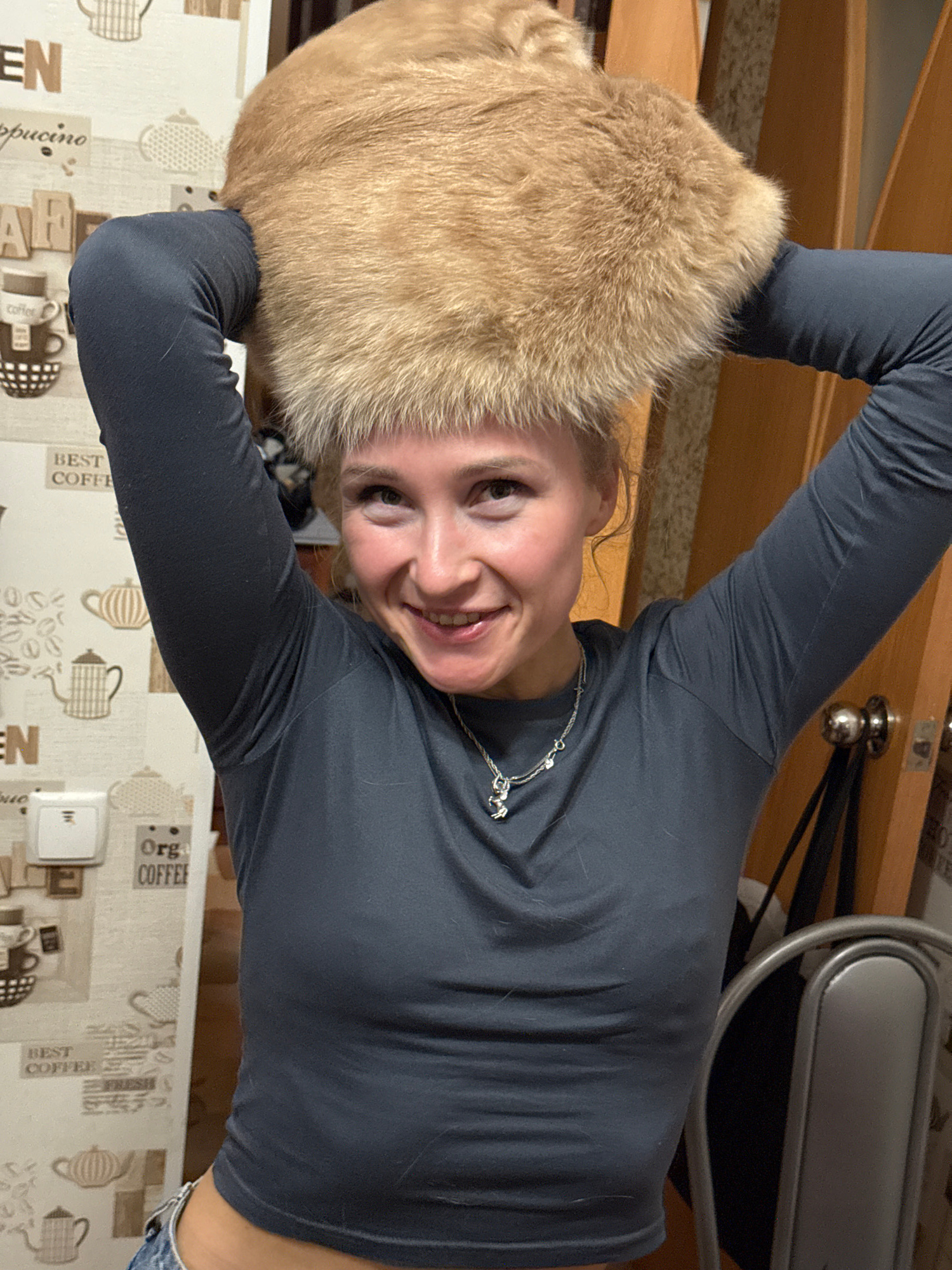 A young woman wearing a gray long-sleeved shirt and a silver necklace is holding a large, furry, light brown object near her head, possibly a hat or animal. She is smiling at the camera. The backgroun…read more
