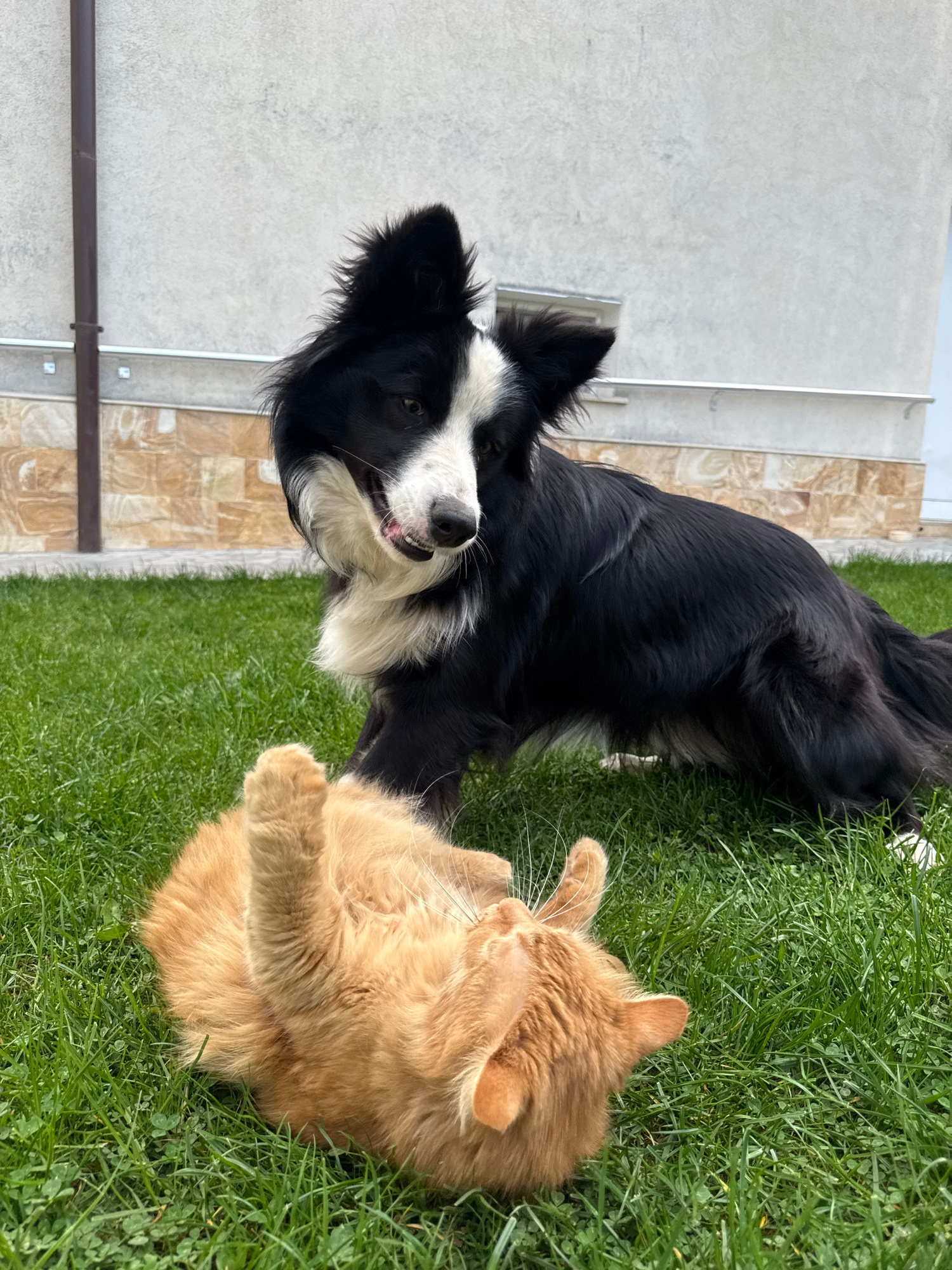 A black and white Border Collie dog and a fluffy orange tabby cat are captured in a friendly interaction on a bright green lawn. The image is oriented sideways, with the subjects lying on what appears…read more