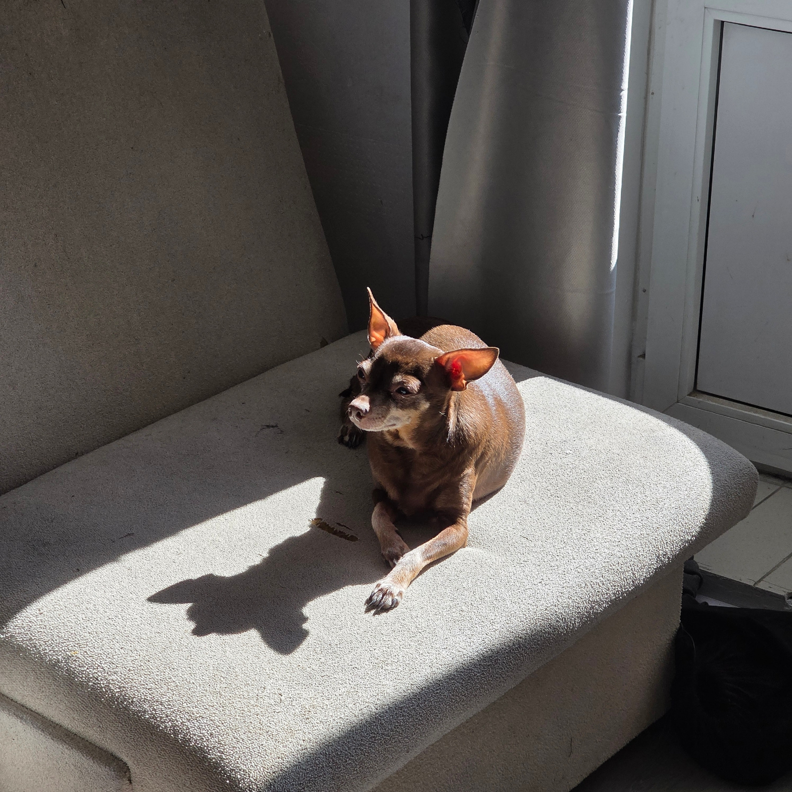 A brown Chihuahua lies on a light-colored, textured surface, possibly a sofa or cushion, in a well-lit indoor environment. The dog's shadow is cast to its right. Part of a window or wall and a dark, a…read more
