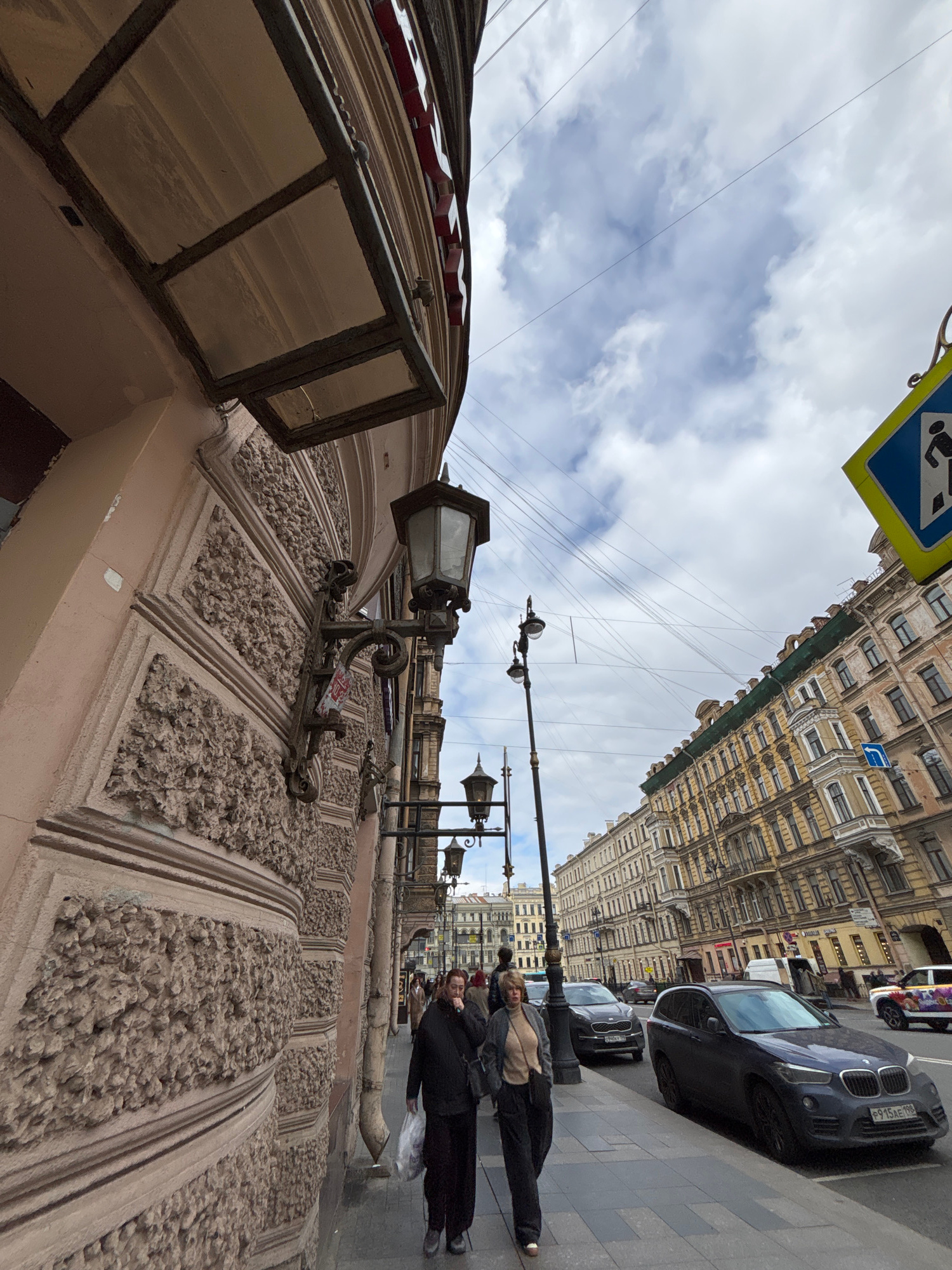 This urban street scene, likely set in Saint Petersburg, Russia, captures a daytime view from a low angle, looking upwards at architectural details and the sky. The original image is rotated, but desc…read more