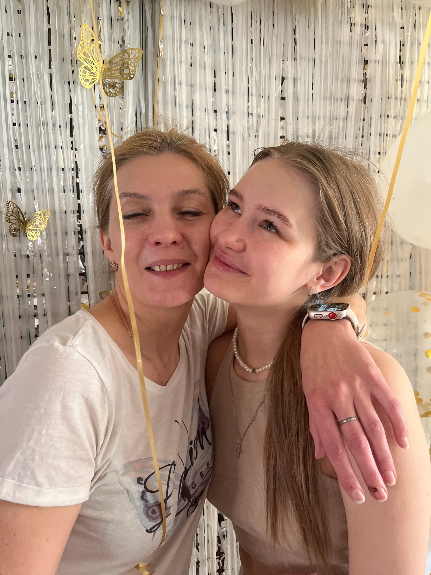 Two women pose closely together in front of a decorative background featuring metallic streamers, gold butterflies, and white balloons. The younger woman, positioned on top, has fair skin, light brown…read more