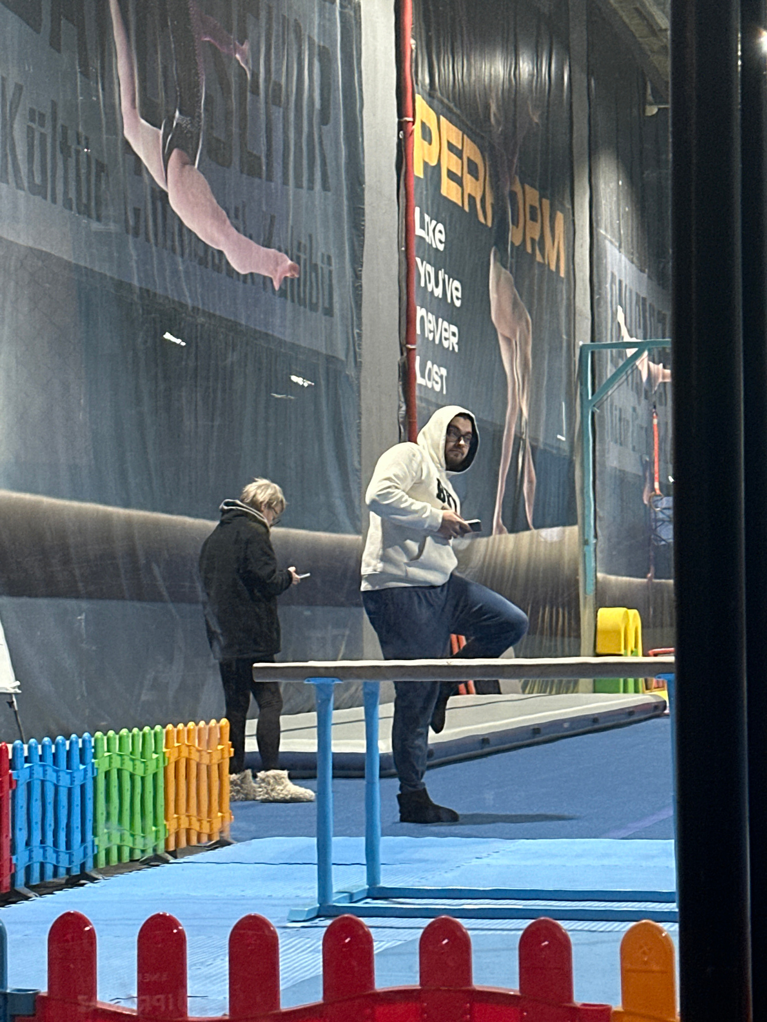 A photo taken in Esenyurt, Turkey, shows two individuals in a space with a large advertisement on the wall. The advertisement is for “PERFORM,” and displays images of athletes. A man wearing a white h…read more