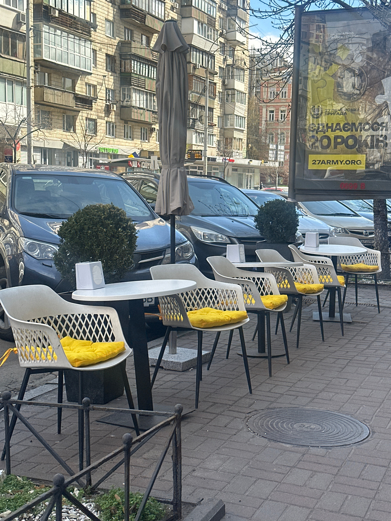 The image shows an outdoor cafe scene in Kyiv, Ukraine. Several white plastic chairs with yellow cushions are arranged alongside small tables. Cars are parked closely along the street adjacent to the…read more
